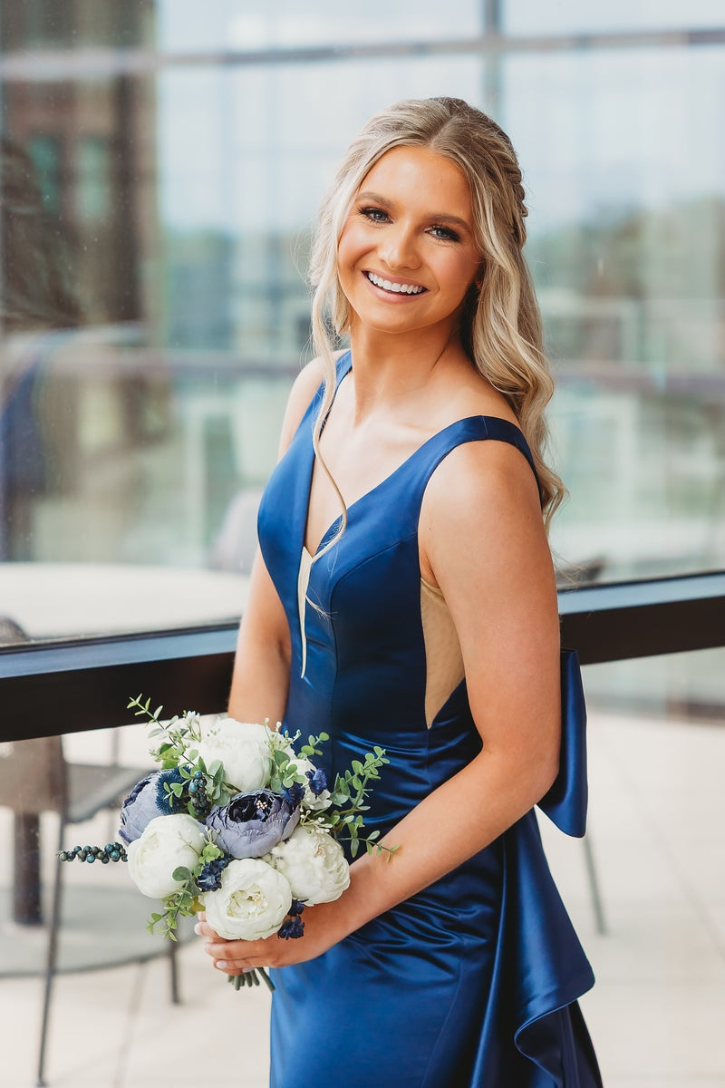 Navy Blue Bow A-Line V-Neck Long Dress
