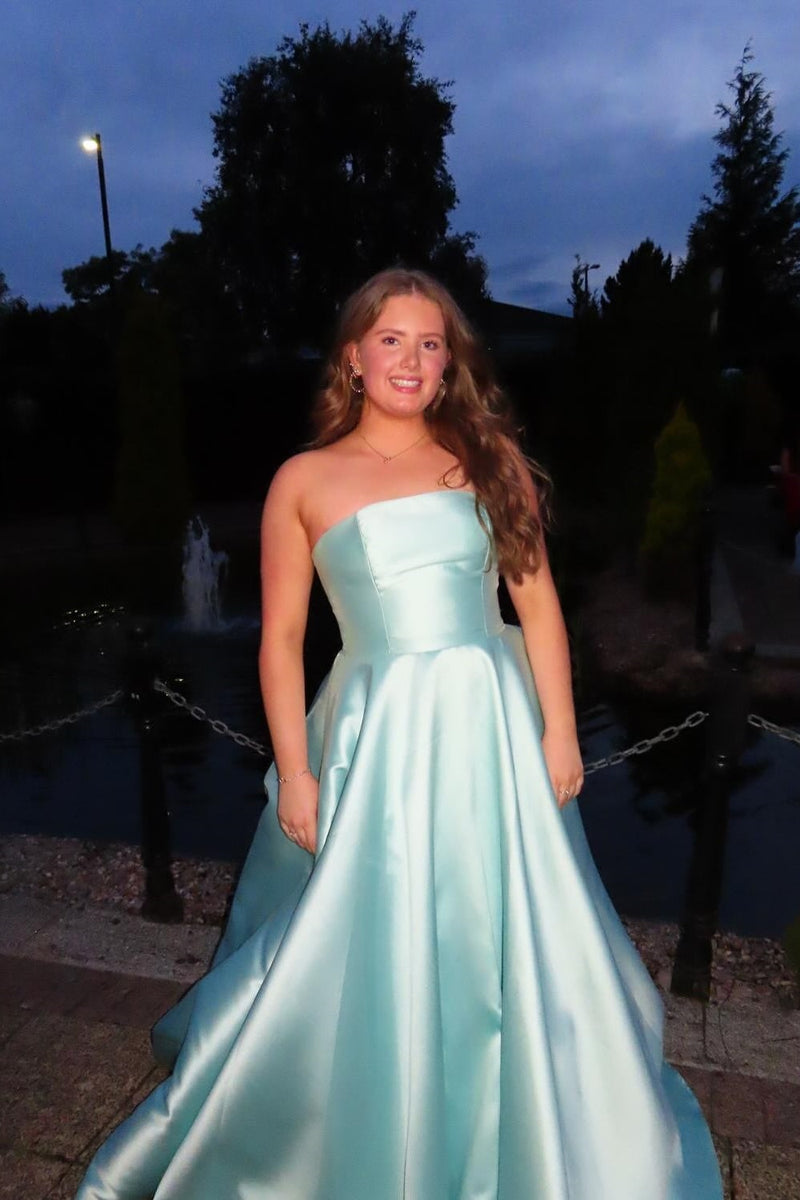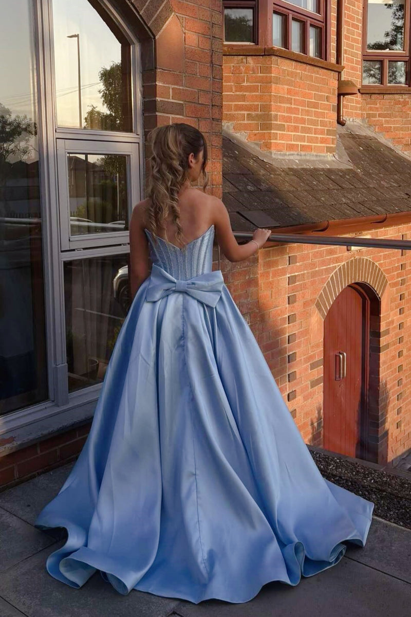 Light Blue Bow A-Line Strapless Long Dress