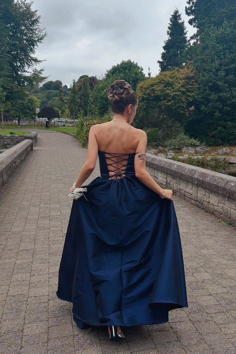Navy Blue Strapless V-Neck A-Line Prom Dress