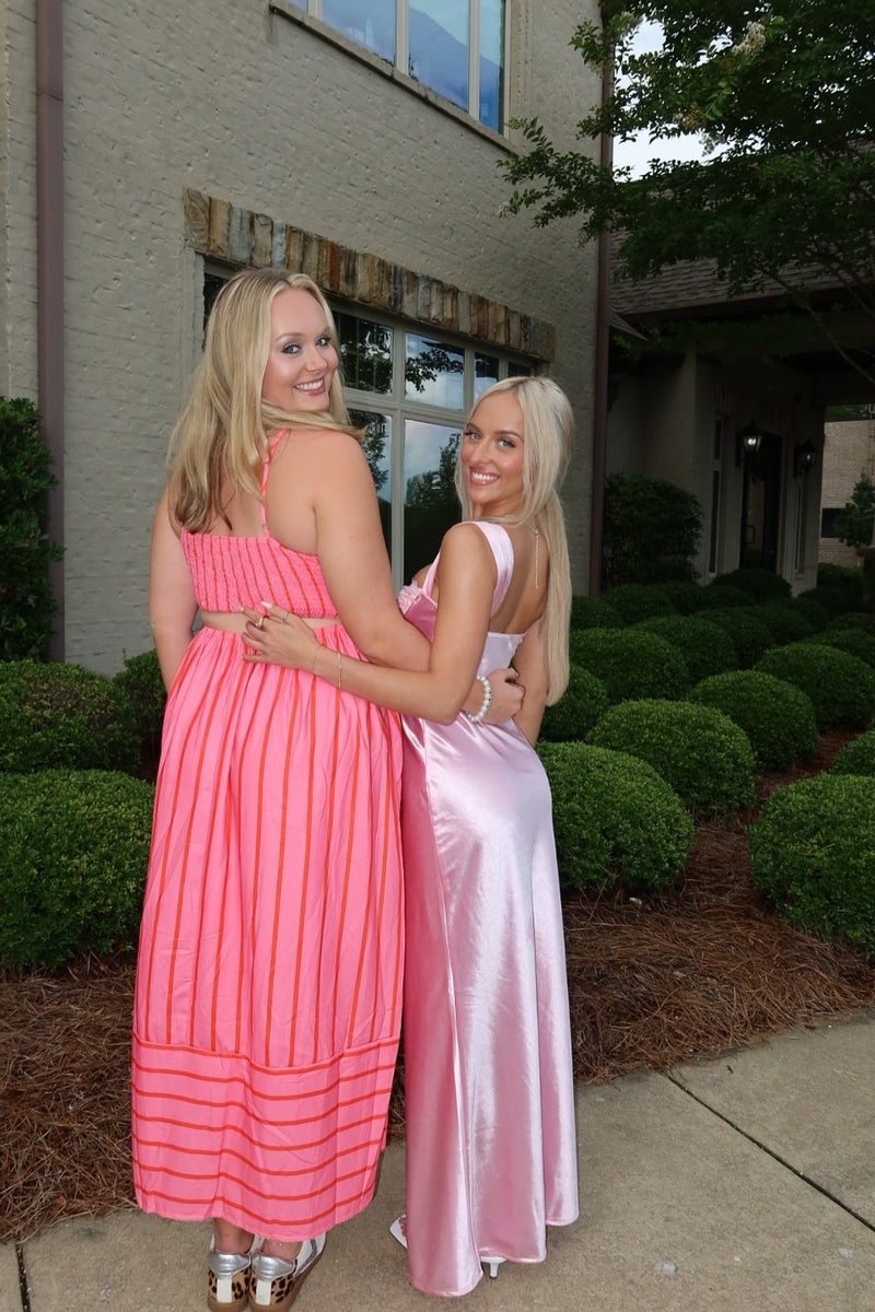 Pink Satin A-Line Lace Bust Long Dress