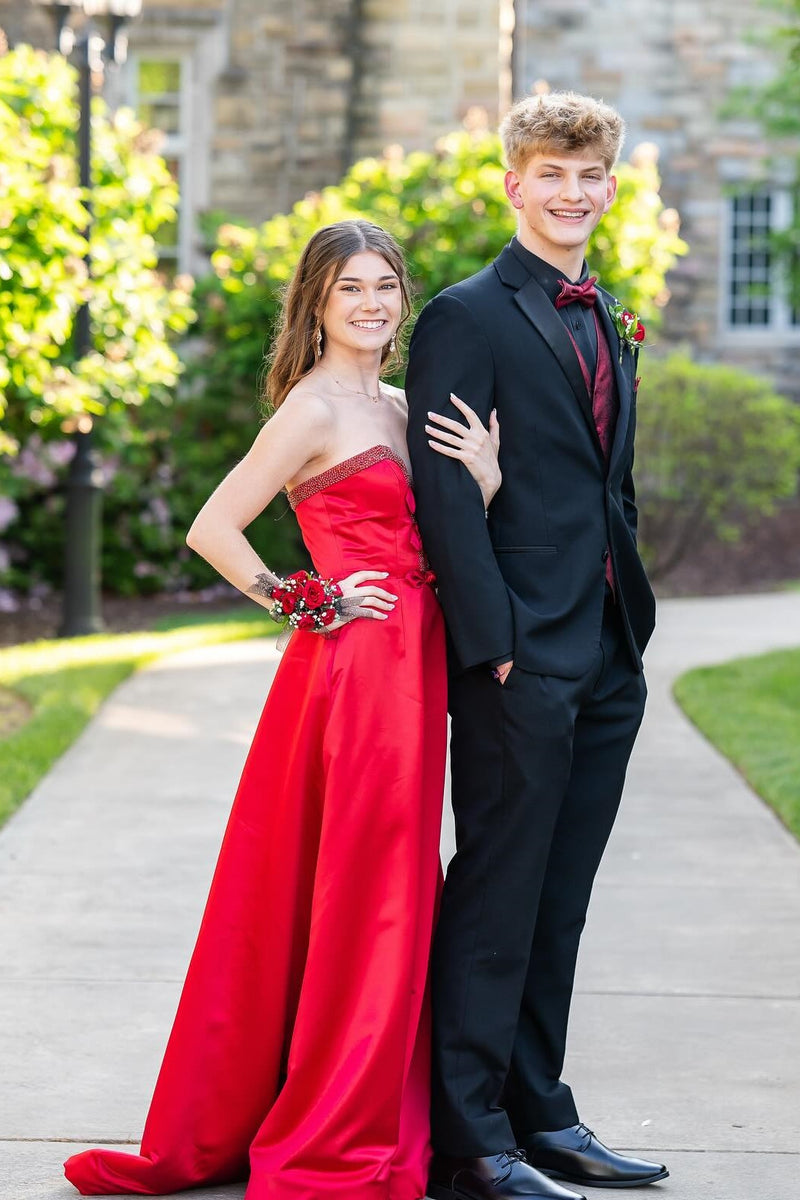 Red Strapless Side Slit Satin A-line Gown