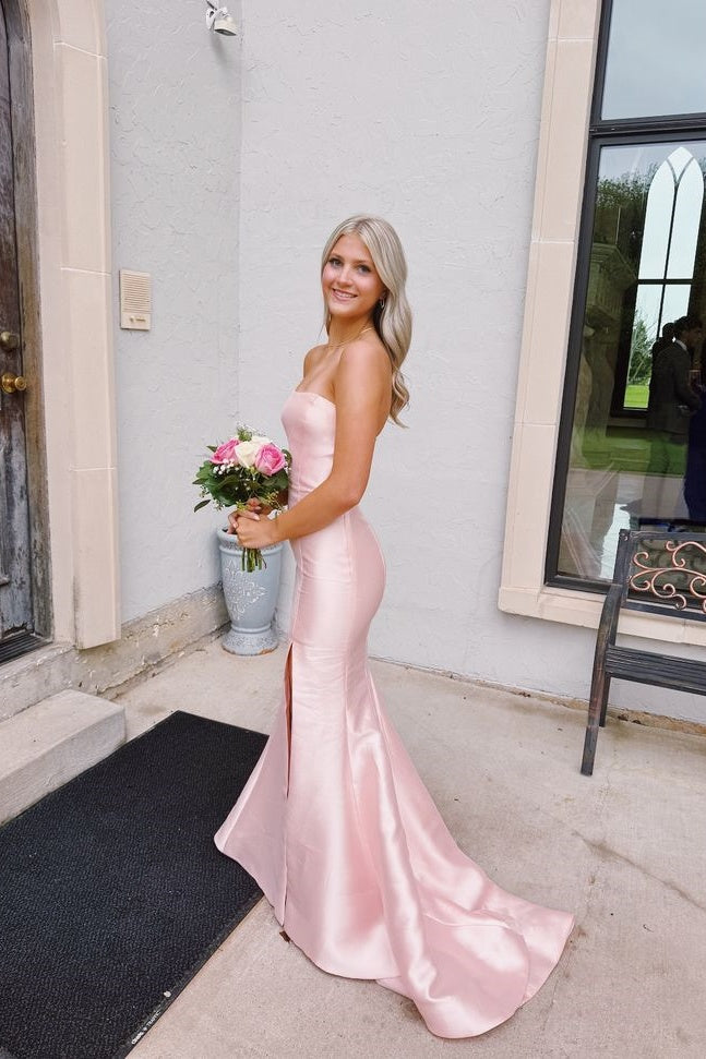 Strapless Slit Rhinestones Satin Fitted Long Dress