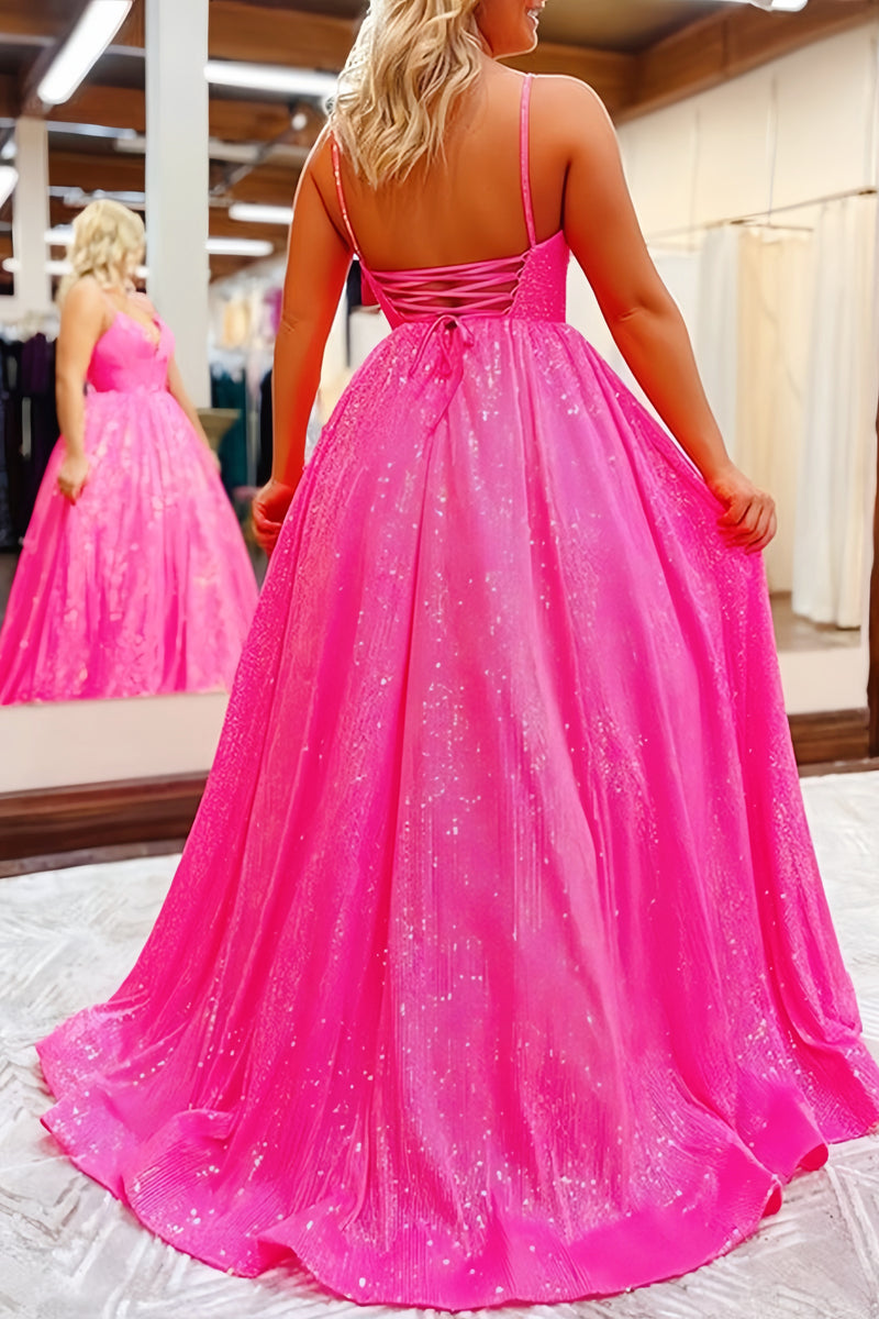Spaghetti Straps Neon Pink Sequin Mermaid Formal Dress