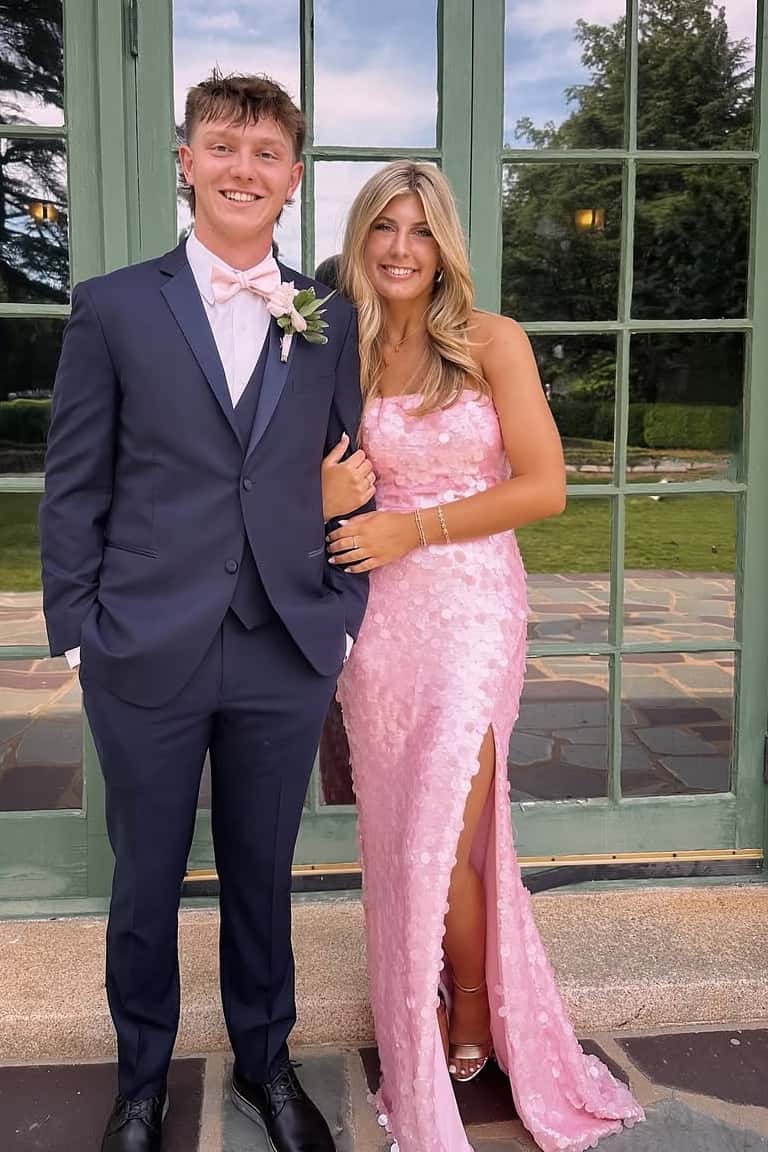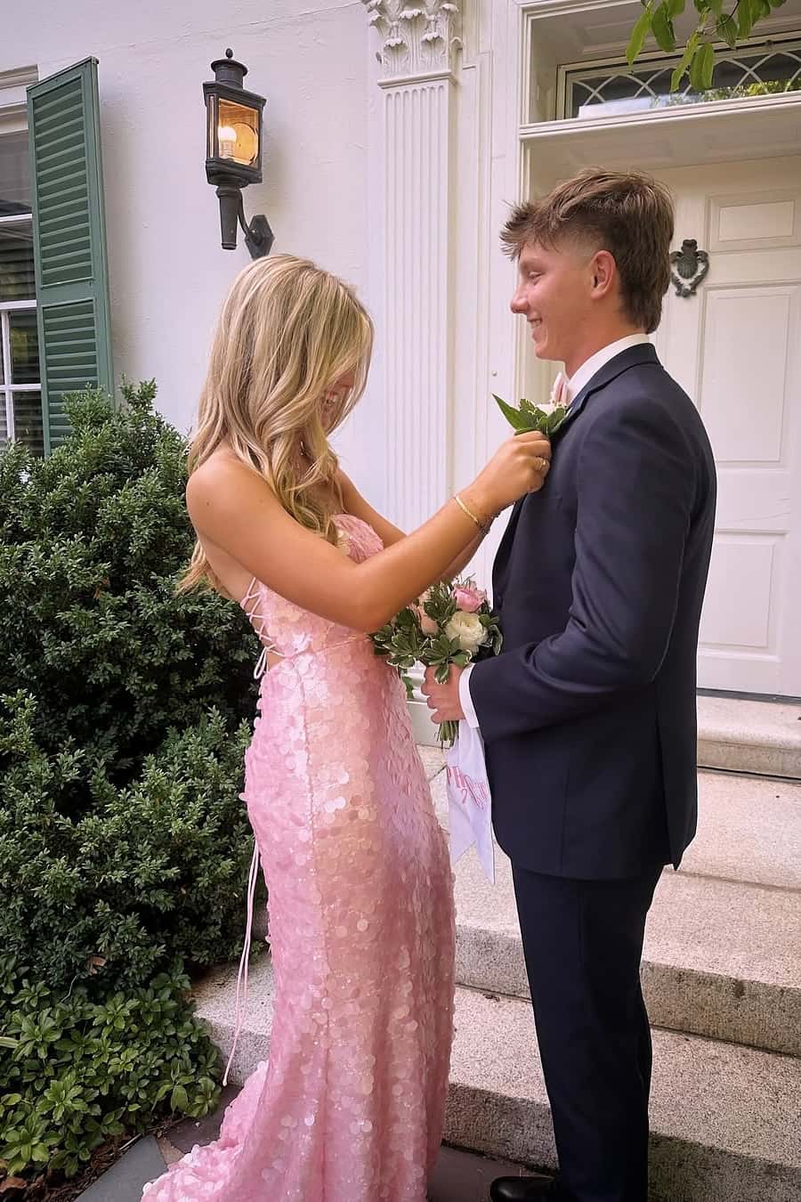 This floor-length gown features a strapless design with a crisscross lace-up back, creating a fitted silhouette that highlights your figure. Adorned with sequins, it offers a flowing hem and a daring high side slit. The backless style adds an elegant, sophisticated touch.