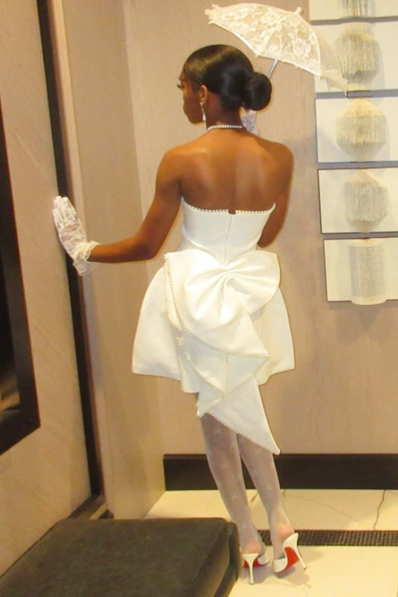 This striking mini dress showcases contemporary design through its form-fitting spandex construction and strapless neckline. Adorned with intricate beading throughout, the piece features a charming bow accent at the back paired with a daring low-back silhouette. The convenient back zipper ensures effortless wear, while the mini length and A-line cut deliver a youthful, fashion-forward aesthetic perfect for evening events and celebrations.