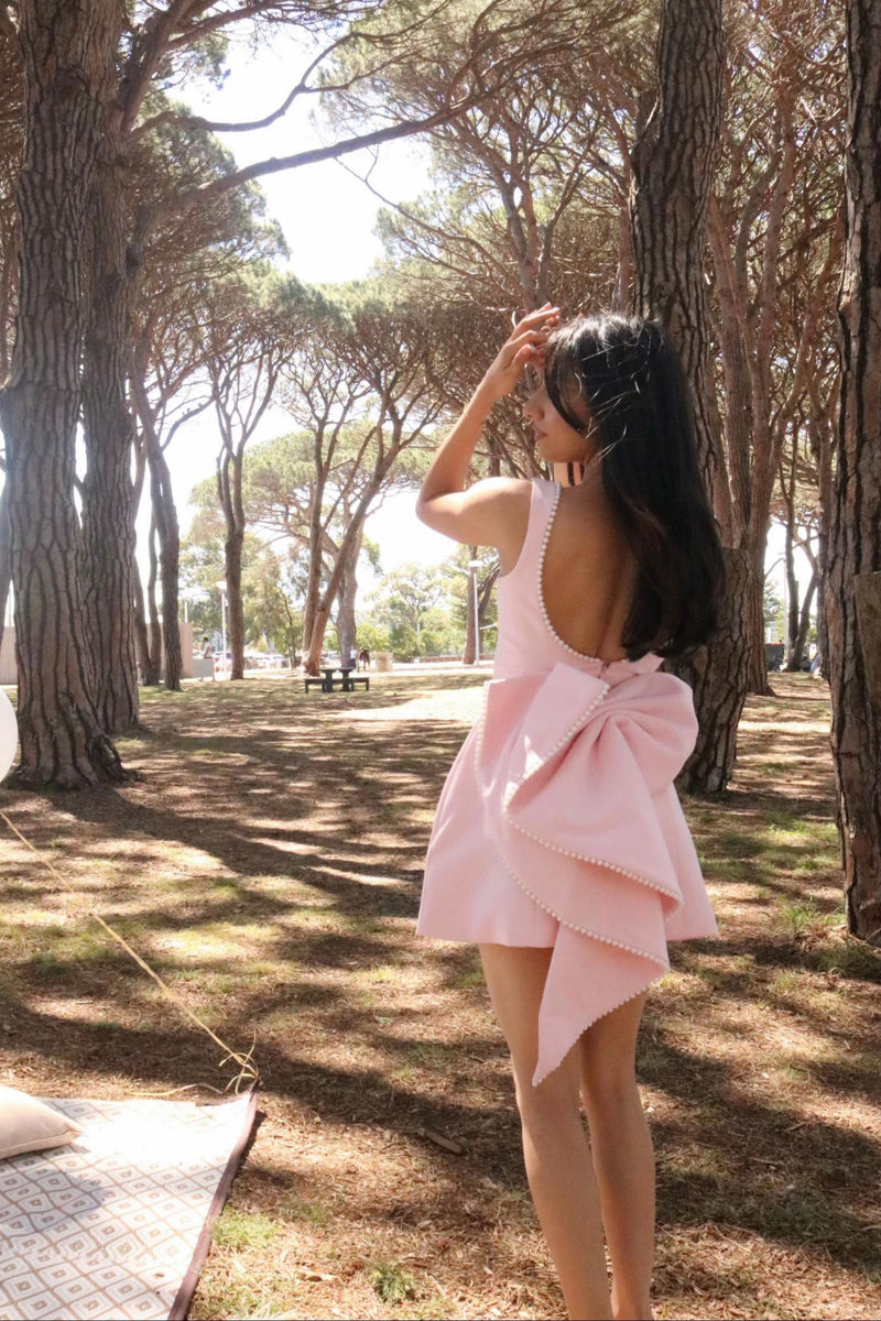 Strapless Light Pink Mini Dress with Bow and Pearl Detailing