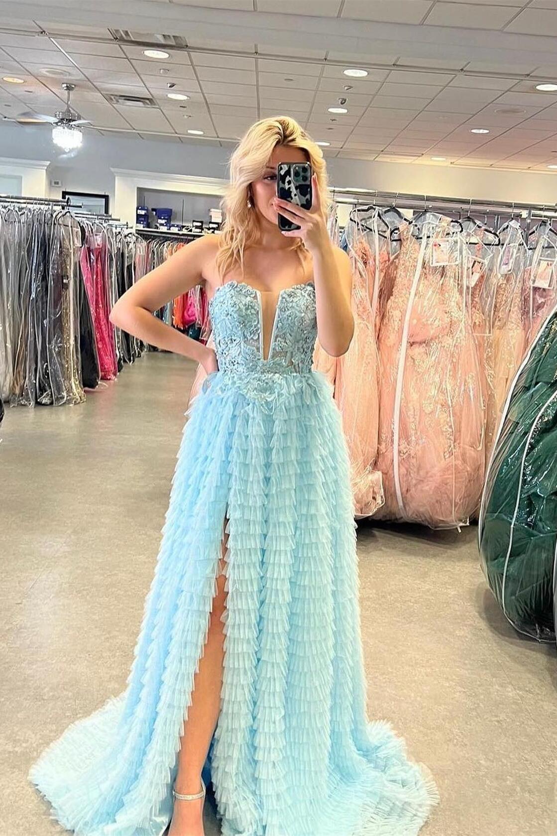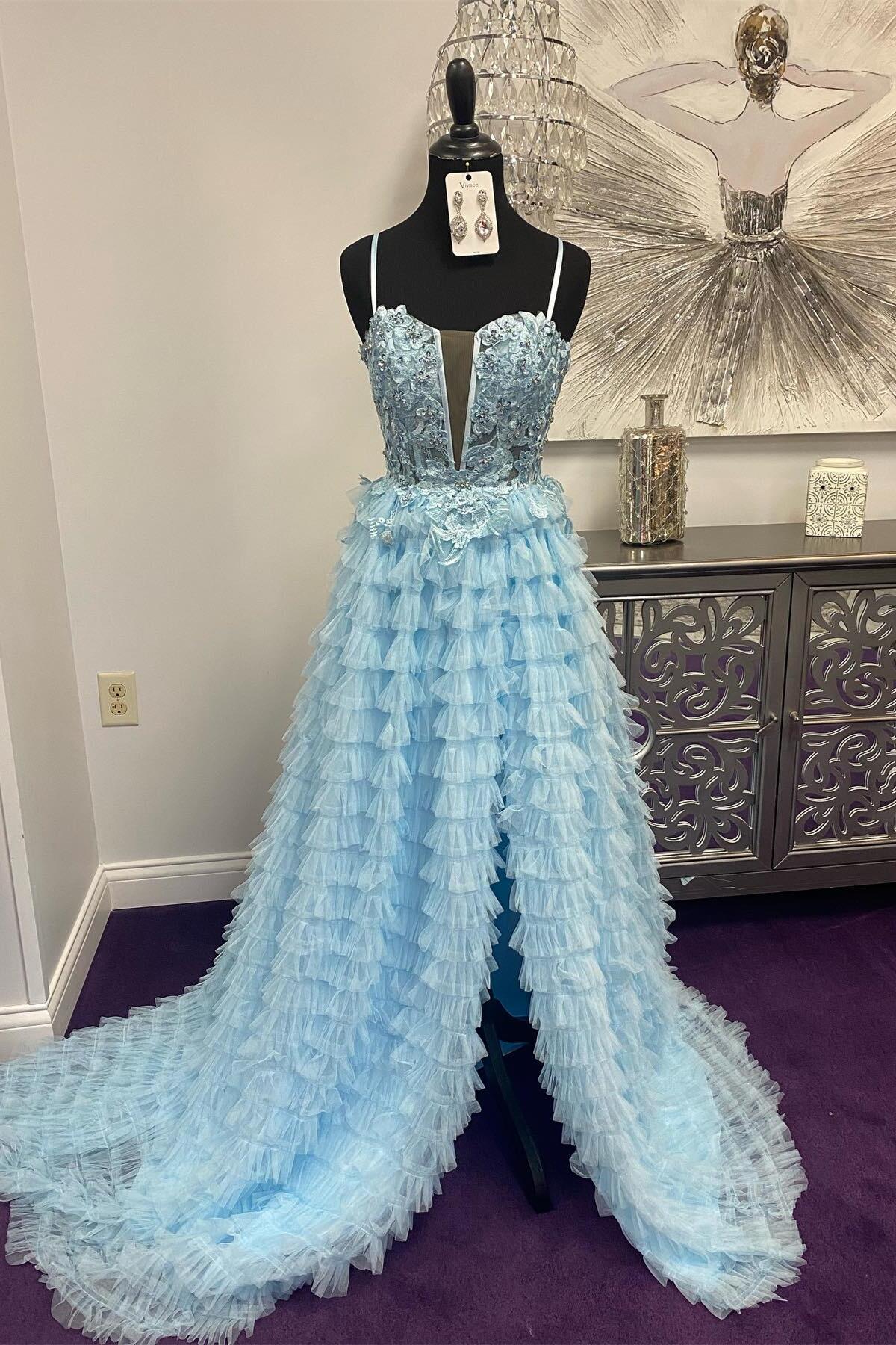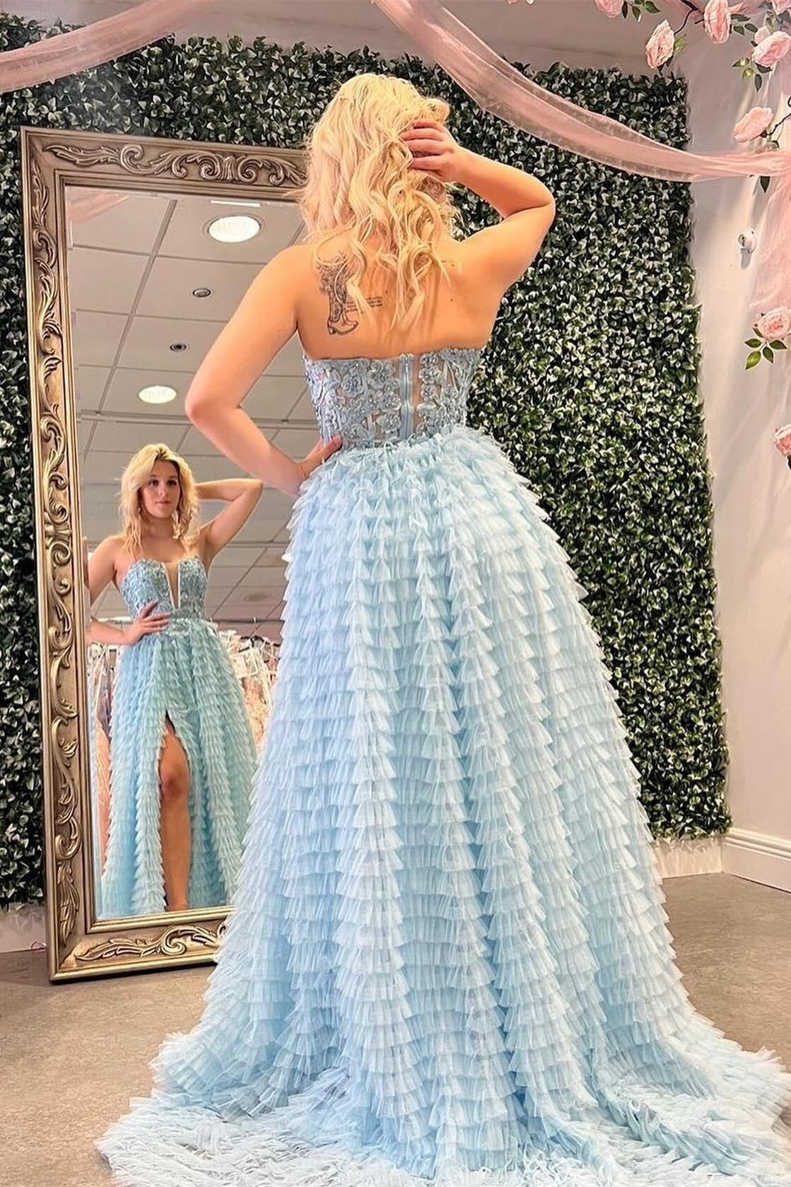 Constructed with a professional eye and knowledge of the industry, the Light Blue Appliques Tiered Prom Dress boasts a stunning A-line silhouette and intricate appliques on the bodice. The full length skirt, crafted from delicate tulle, cascades into tiered layers for a dramatic effect. Complete with a secure zip-up back, this dress exudes elegance and sophistication in a beautiful light blue color.