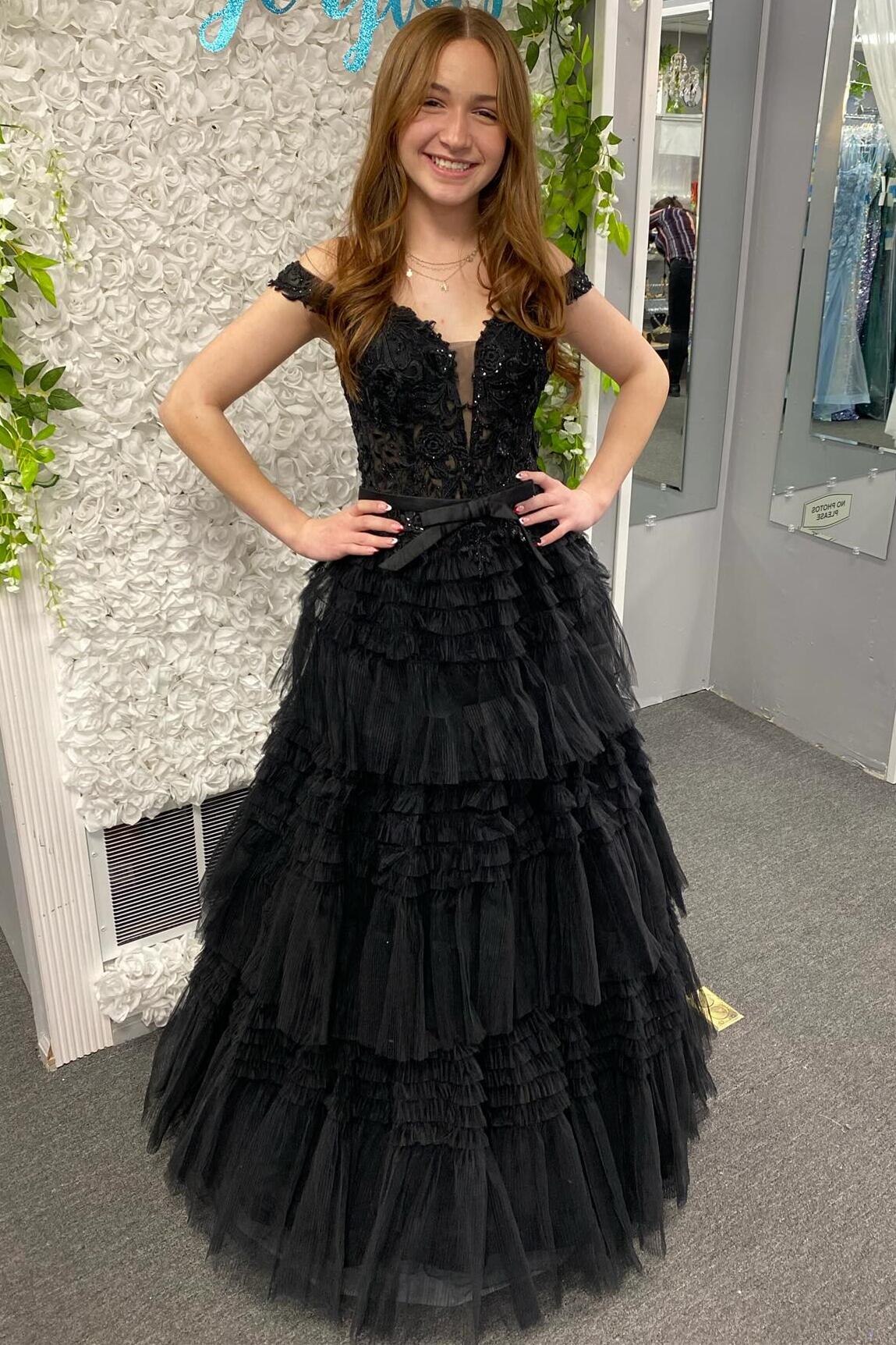 Crafted from luxurious tulle material and featuring an A-line silhouette, this gown showcases stunning fuchsia color. The off the shoulder bodice is adorned with delicate lace appliques, while the full length skirt is adorned with tiered ruffles. The lace-up back provides a secure and elegant fit.
