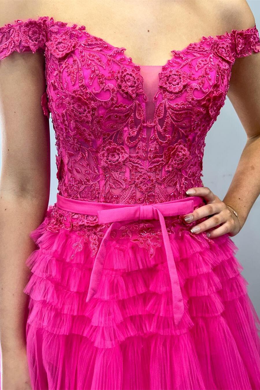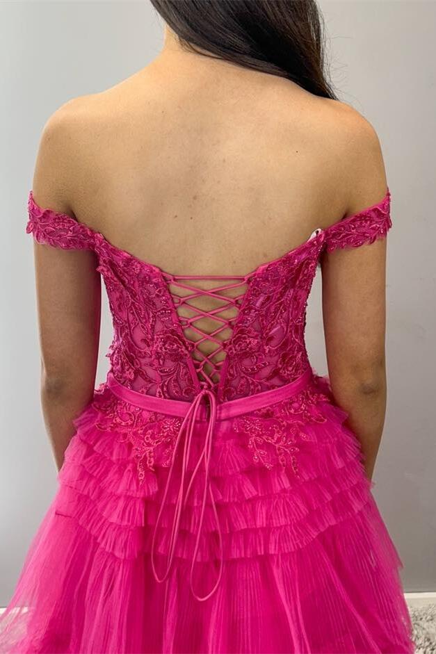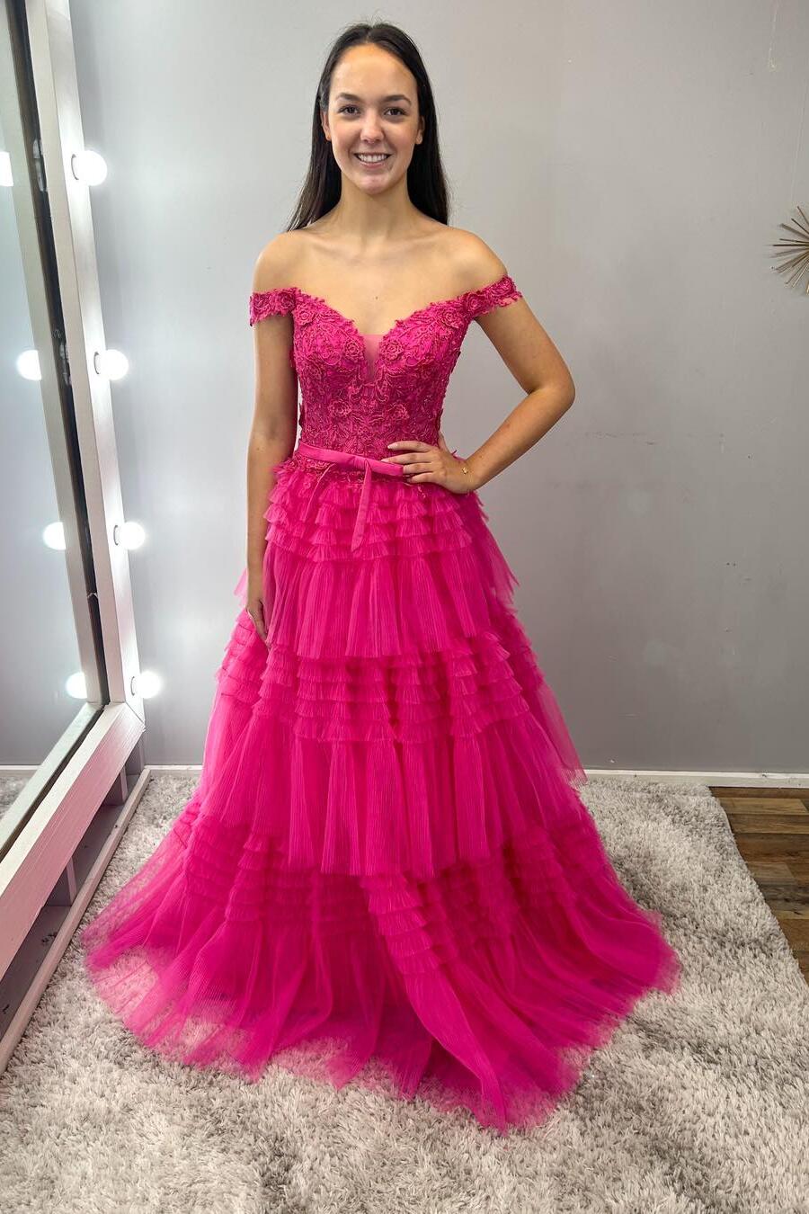 Off the Shoulder Fuchsia Appliques Tiered Ruffles Gown