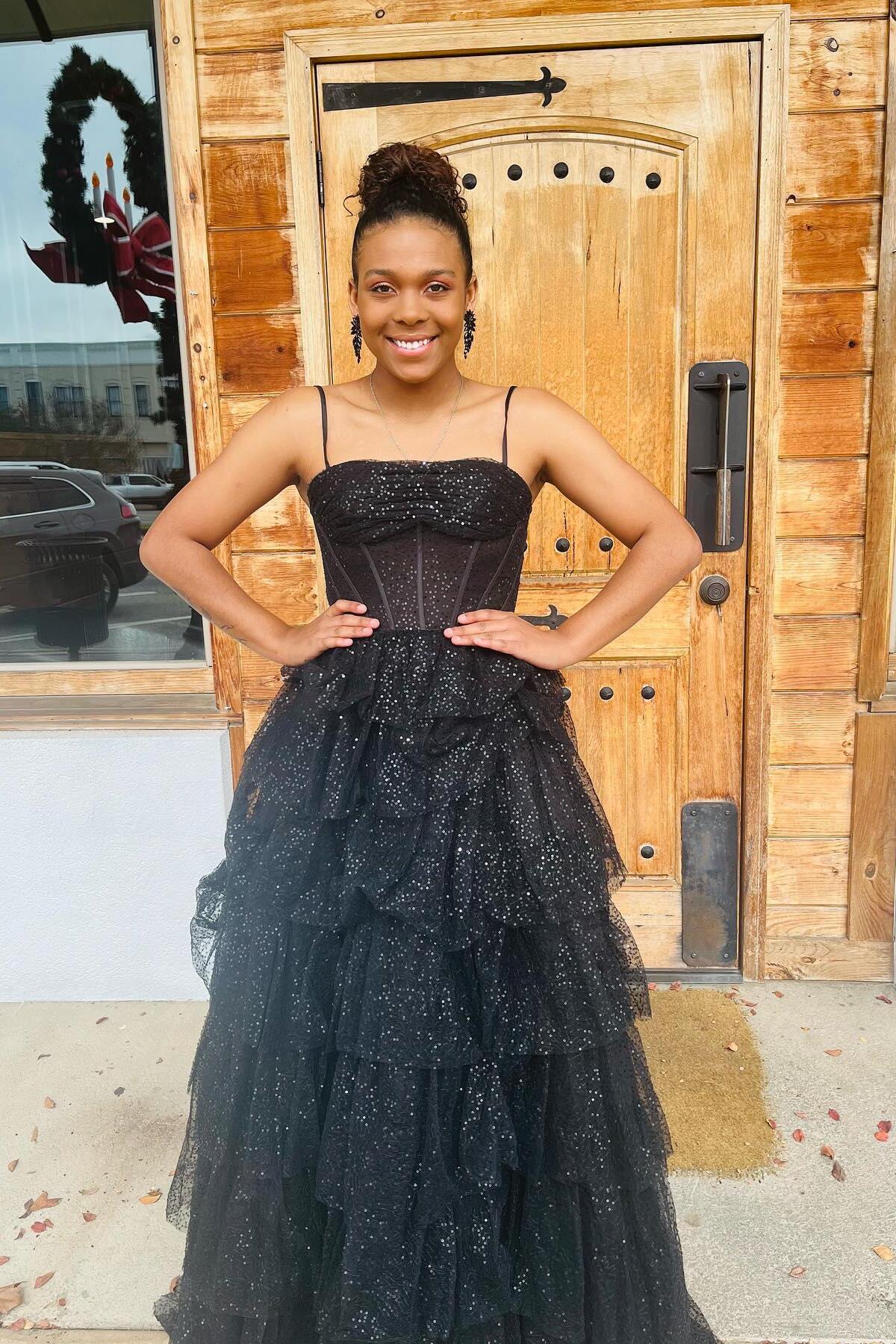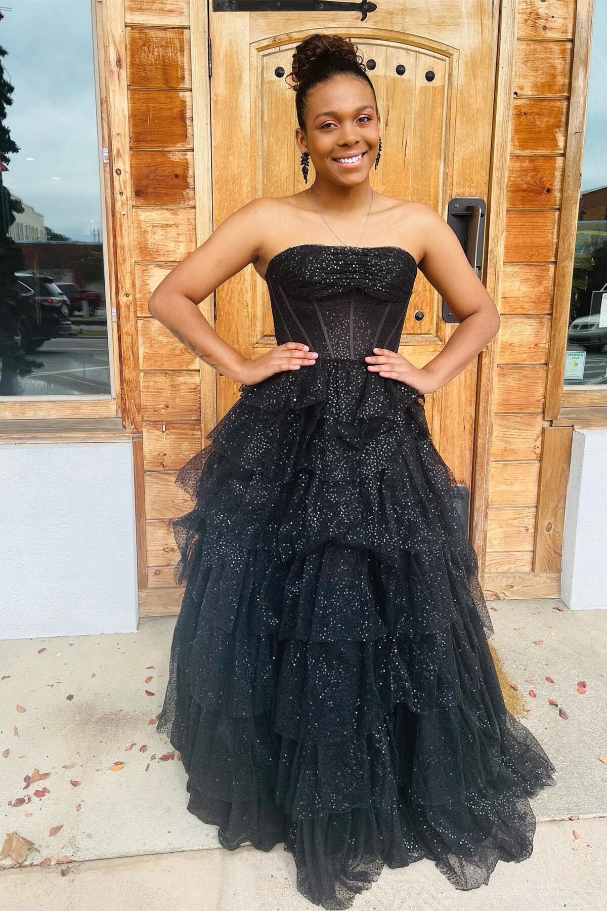 Strapless Black Tulle Tiered Ruffle Dress