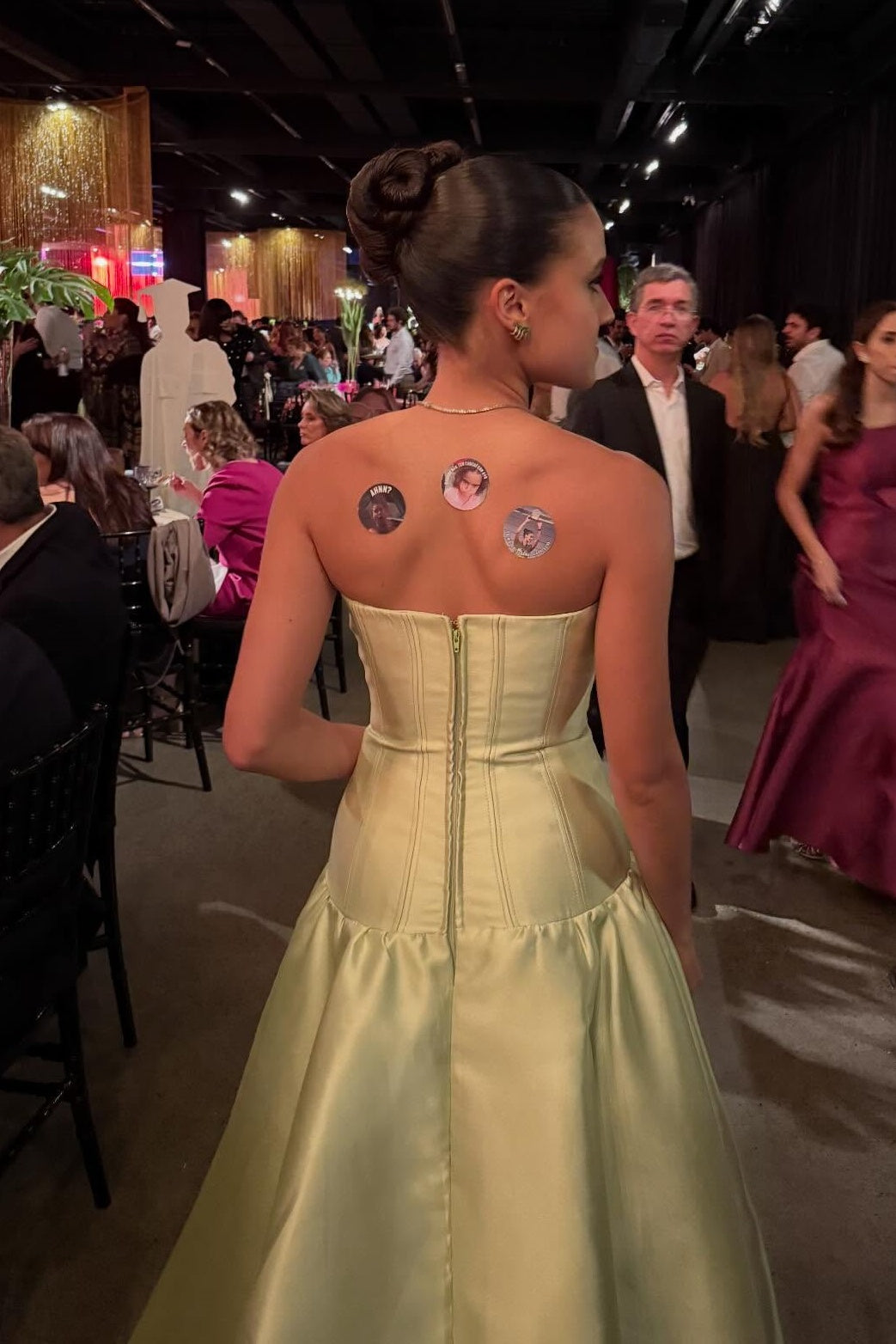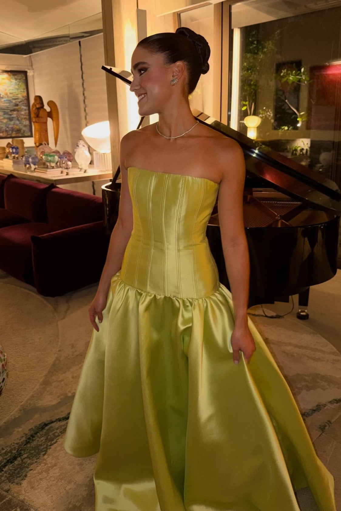 Elegant green satin A-line dress featuring a strapless neckline and floor-length cut. Back zipper closure ensures a polished fit for formal occasions.