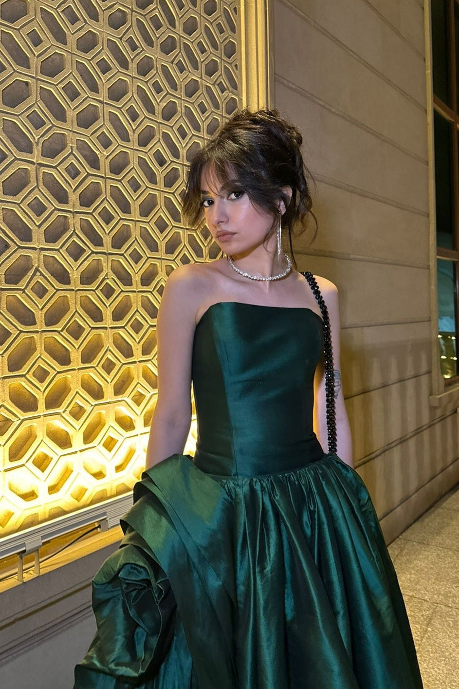 Elegant forest green satin A-line dress featuring a strapless neckline, floor-length cut, and dramatic side slit adorned with an oversized rose detail. Back zipper closure for easy wear.