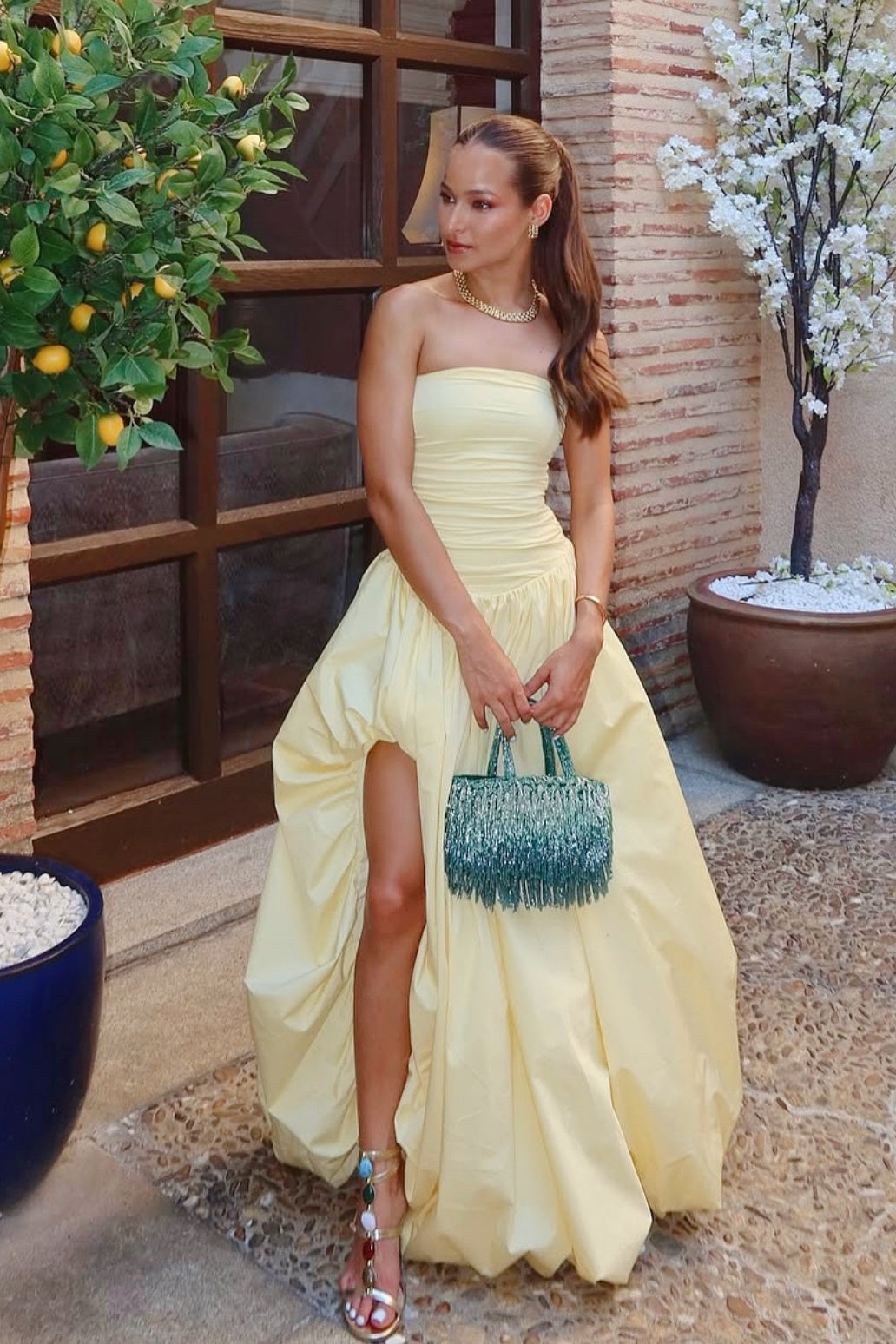 Strapless Yellow Slit Long Dress
