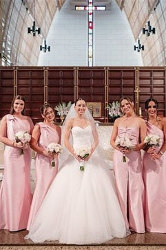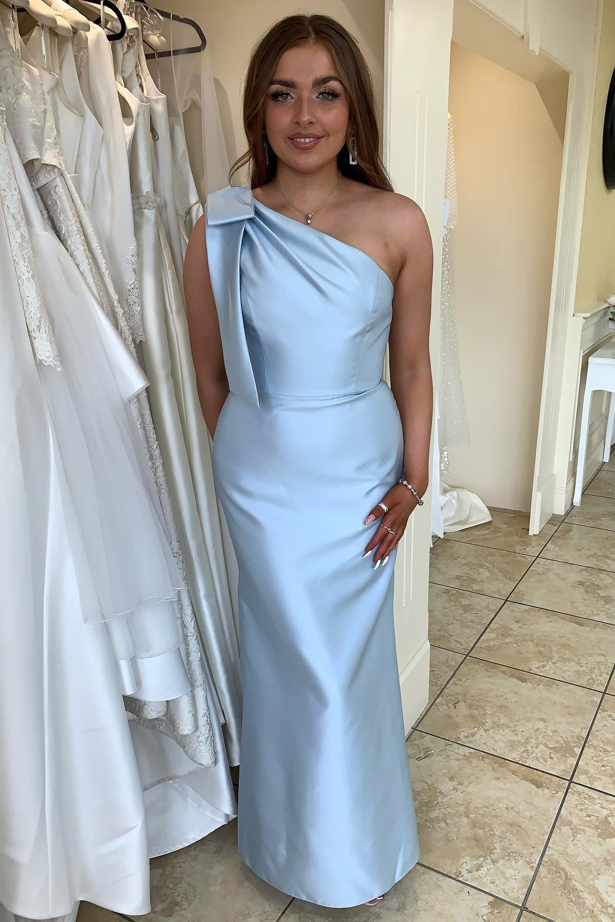 This elegant bridesmaid dress features a stunning sheath silhouette, made from luxurious satin fabric in a delicate light blue color. The one shoulder design is enhanced with a beautiful bow detail, and the dress is completed with a full length and a convenient zip-up back closure.