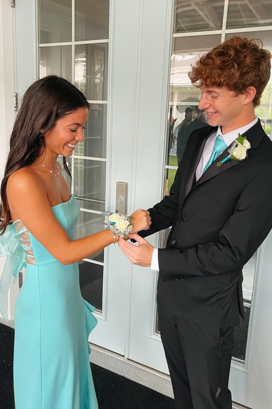 This long dress features an asymmetric ruffled hem and a flattering bodycon silhouette crafted from polyester. Designed in cyan, it showcases a strapless style with tie-back straps and a low back, complemented by a flowy hem for elegant movement.