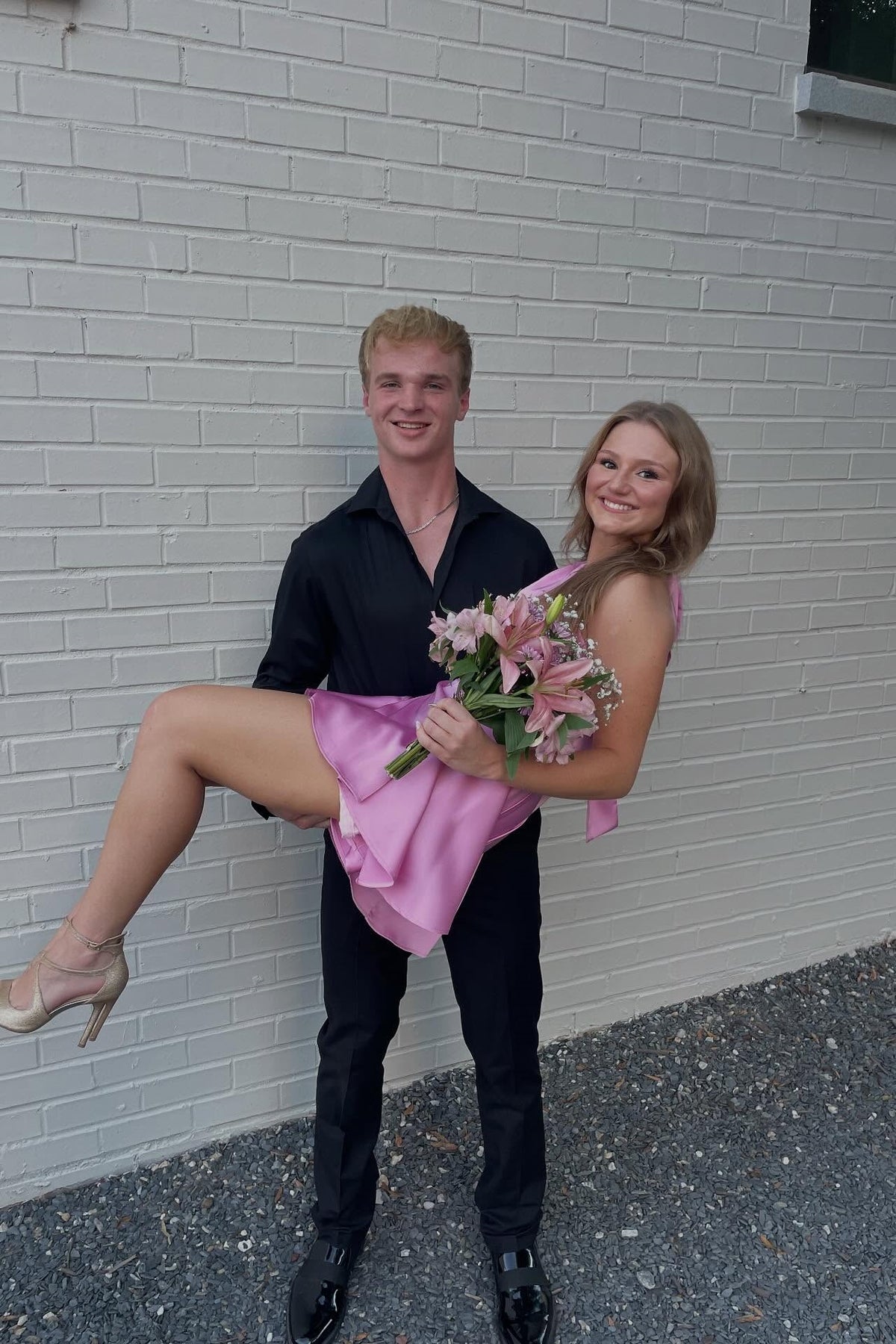 This mini dress features a light pink polyester fabric with an A-line silhouette. It showcases a halter neckline with a V-neck design, complemented by an open back and a flowing hem for elegant movement.