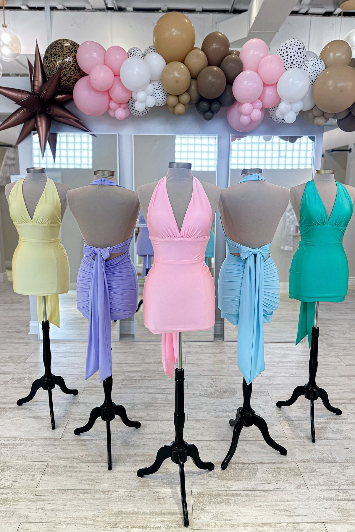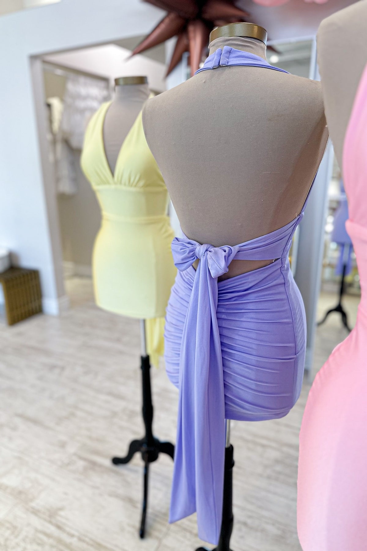 Crafted from chiffon, this light yellow halter mini dress features a bodycon fit with a V-neckline and an open back secured by a tie. The stretchy fabric and ruched bust design enhance both comfort and style, making it a striking choice for any occasion.