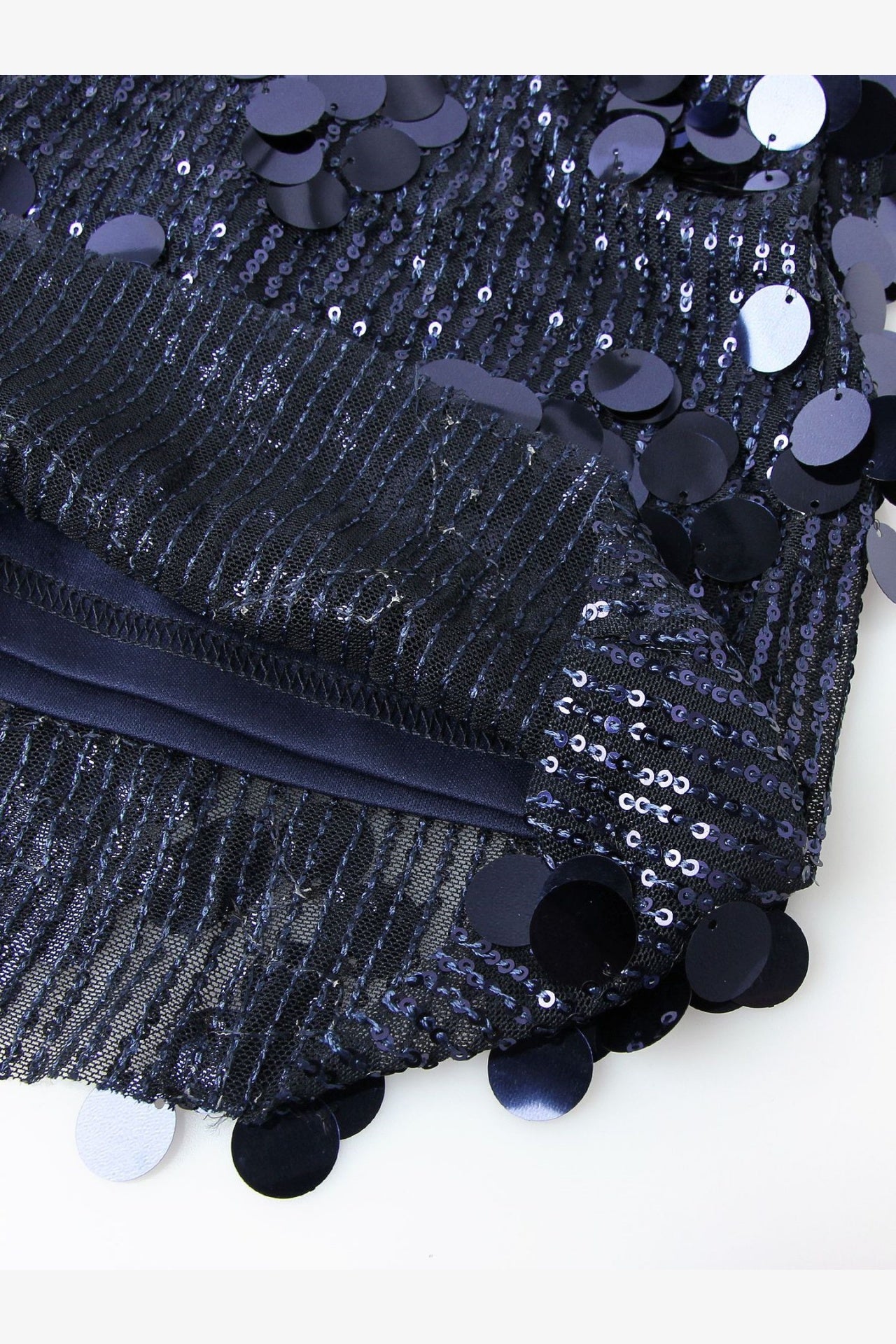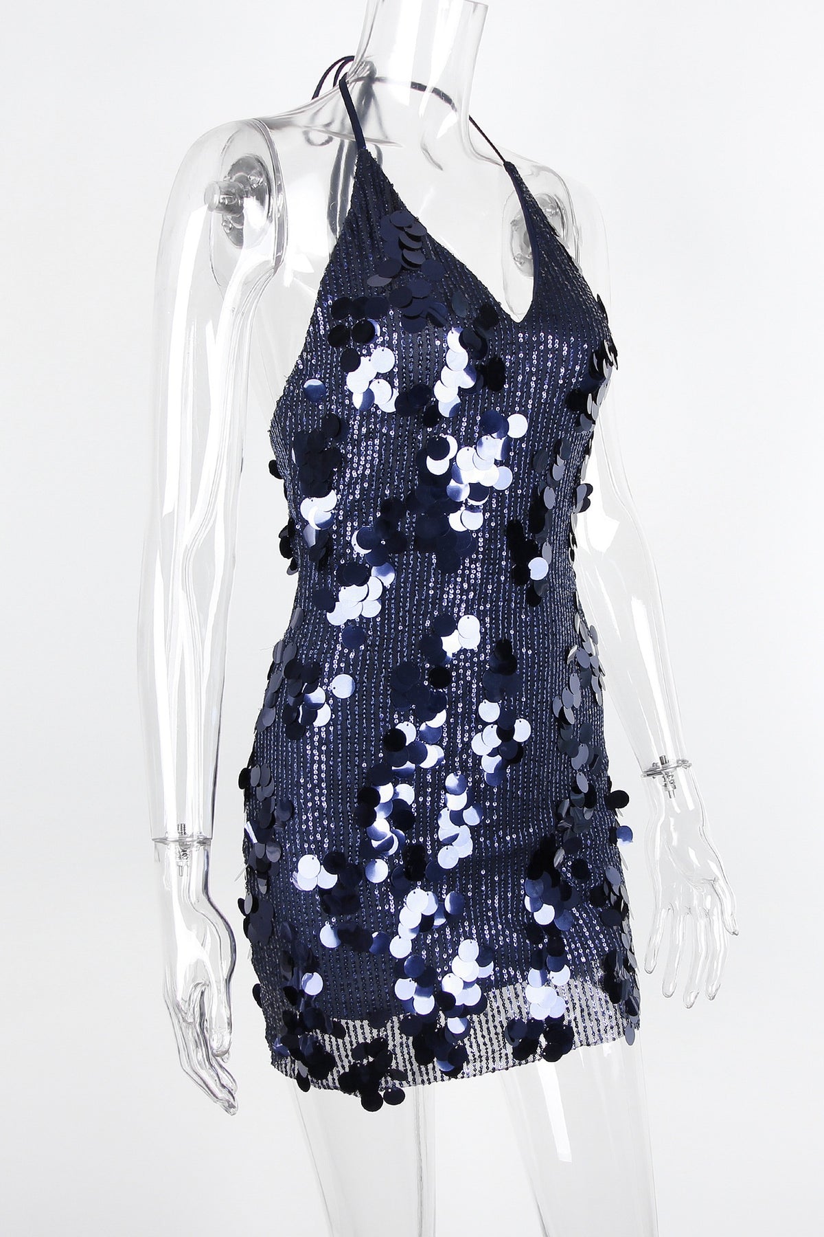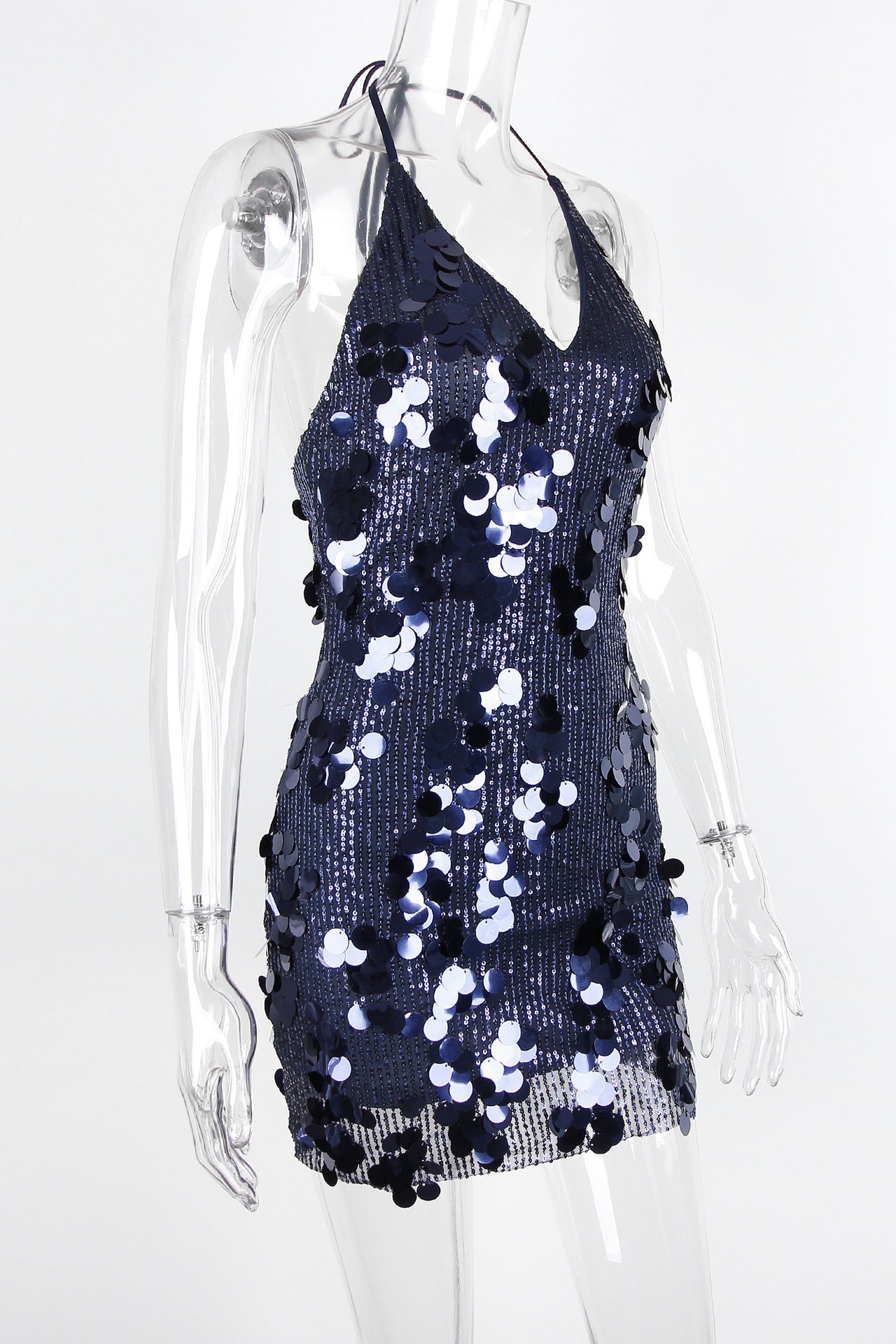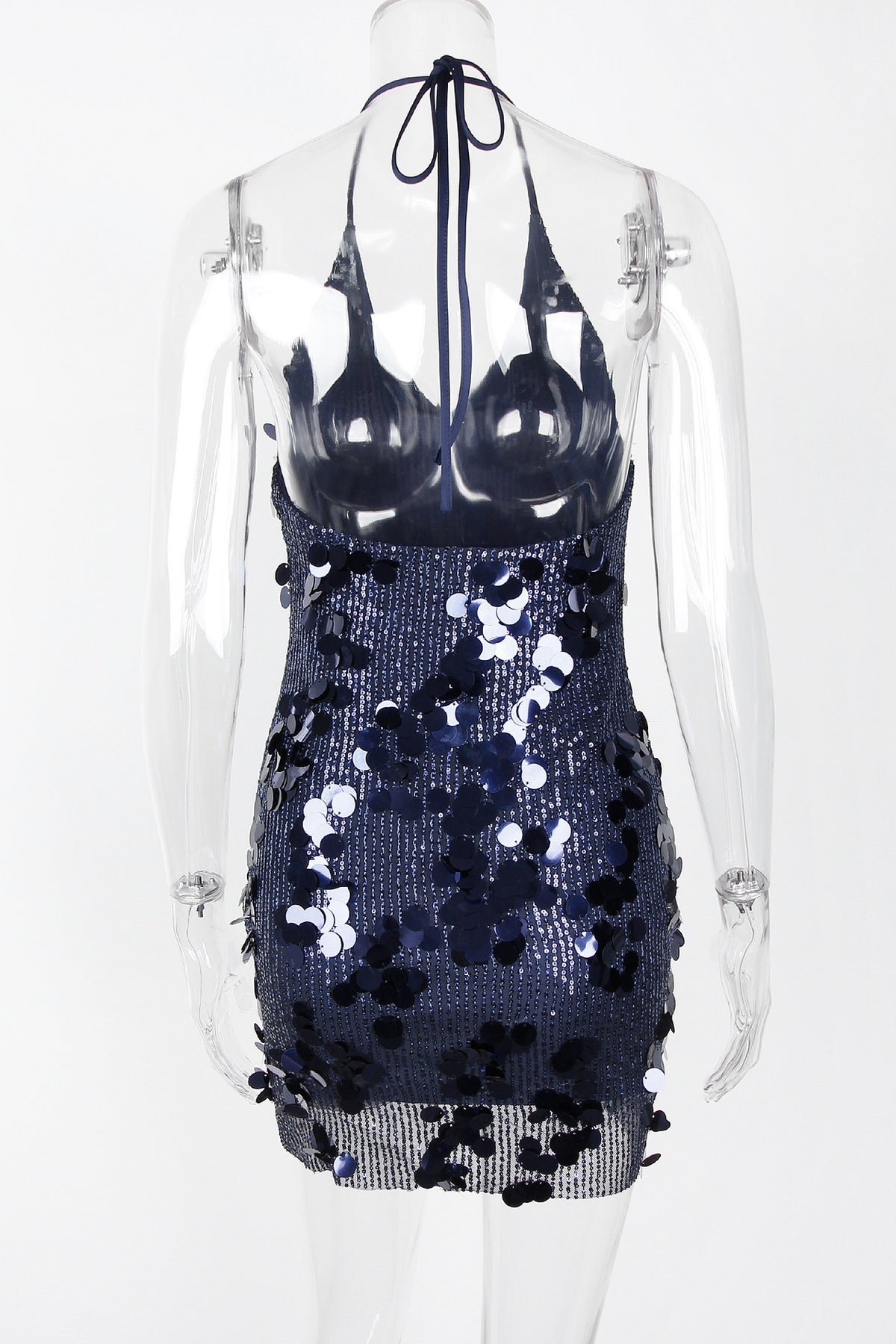 Navy blue sequin mini dress with halter tie neckline, V-neck, and open back. The bodycon silhouette delivers a striking look for evening events.