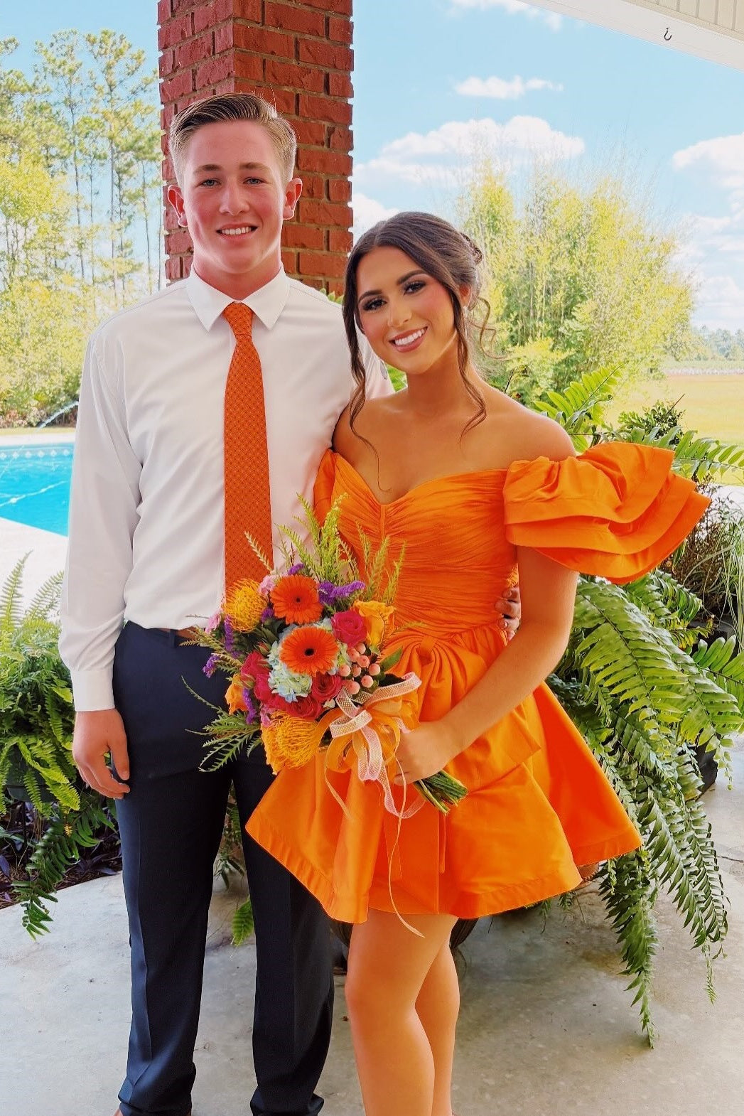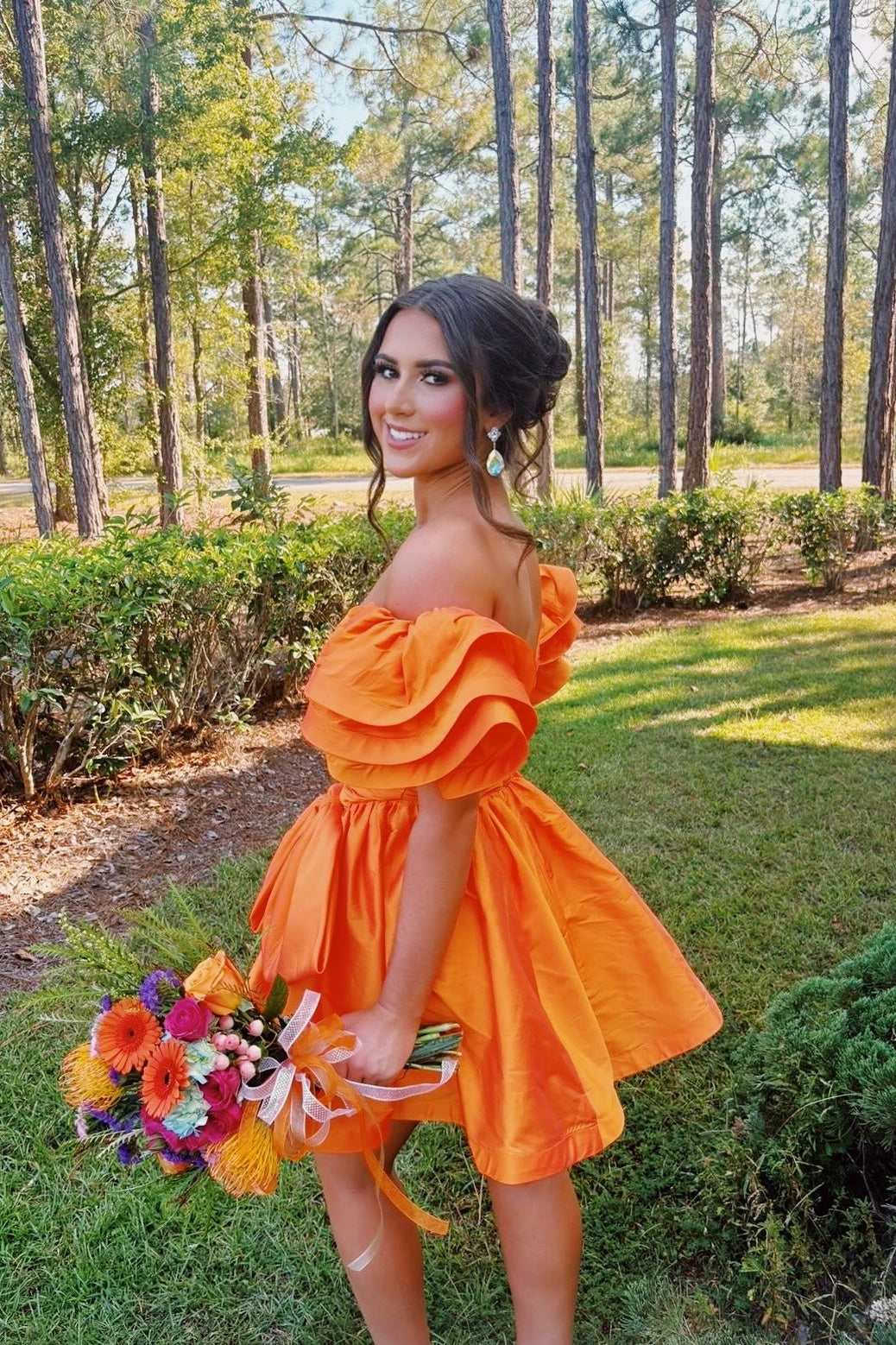 Crafted from taffeta in a striking blue shade, this off-shoulder dress features an A-line silhouette with elegant ruffle details on both the bodice and sleeves. Accented by a waist bow, the design includes a voluminous hem that falls above the knee, combining sophistication with a playful touch.