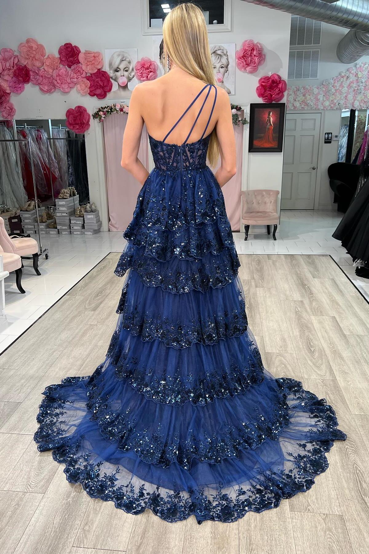 This formal dress features a one shoulder design with an A-line silhouette and tiered ruffles. The light blue color is complemented by sequin appliques on tulle material. A side slit and zip-up back complete the look.