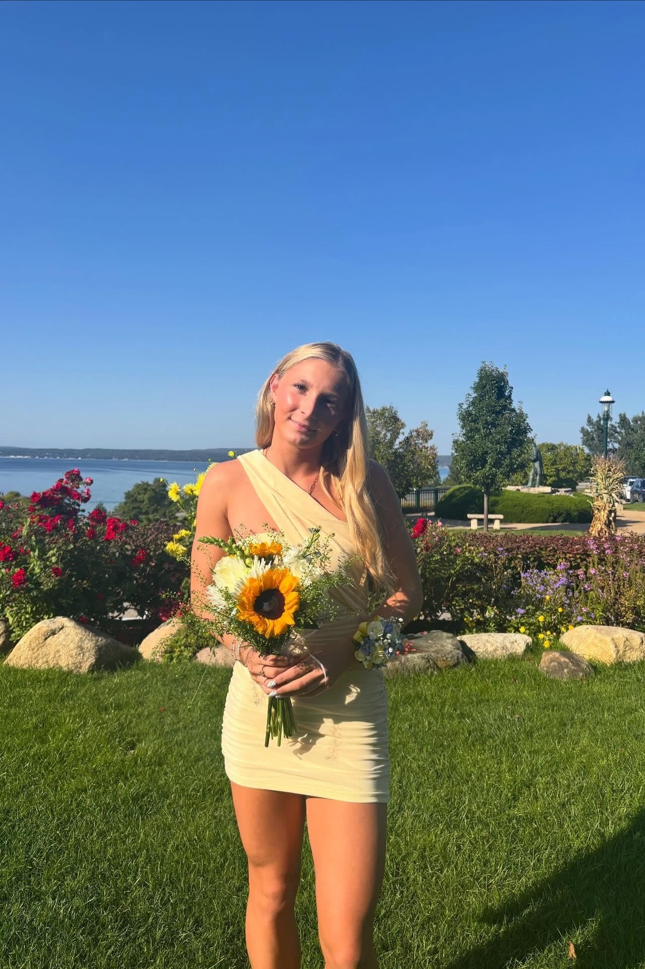This mini dress features light yellow satin fabric with a pleated design. It highlights a one-shoulder strap paired with a halter-style flowing ribbon and showcases a low back cut for an elegant silhouette.