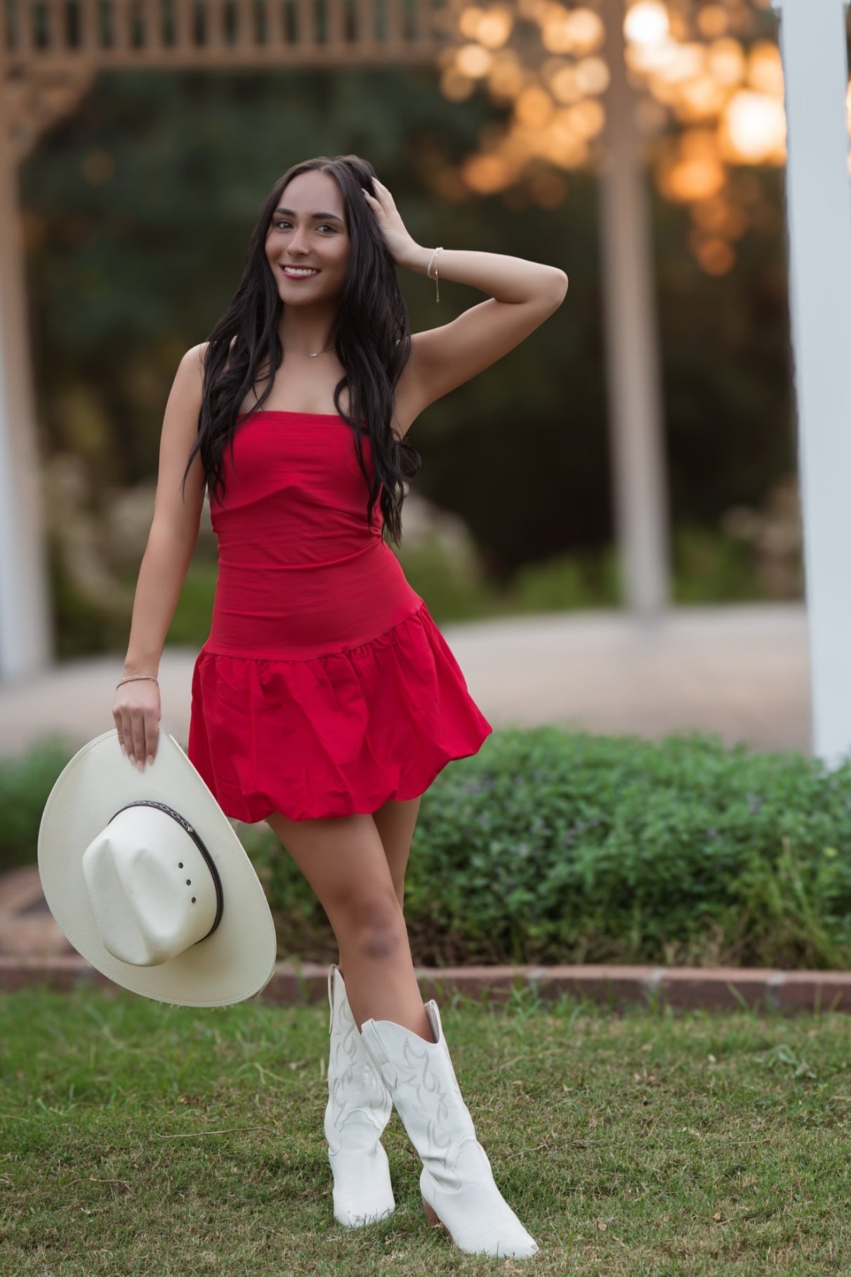 This striking strapless design features a luxurious polyester construction in a bold red hue, crafted with a flattering A-line silhouette that skims the body gracefully. The bubble hem adds playful dimension while the above-knee cut keeps the look modern and versatile. A daring low back detail elevates the piece, making it an ideal choice for cocktail events and upscale gatherings where you want to make a memorable impression.