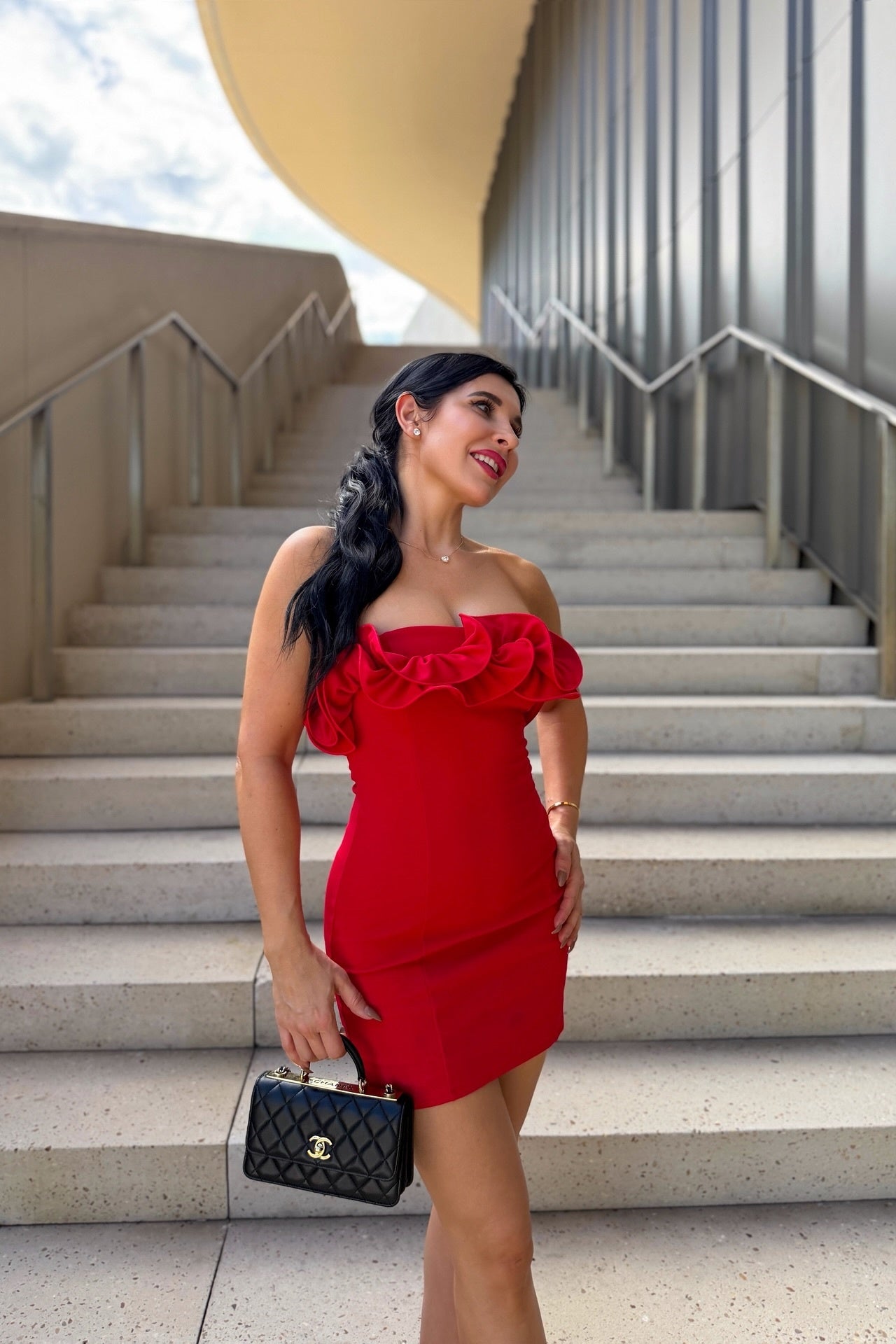 Red Bodycon Strapless Ruffle Neckline Mini Dress