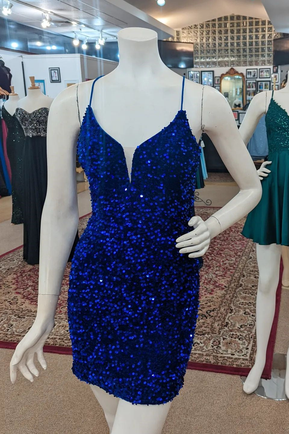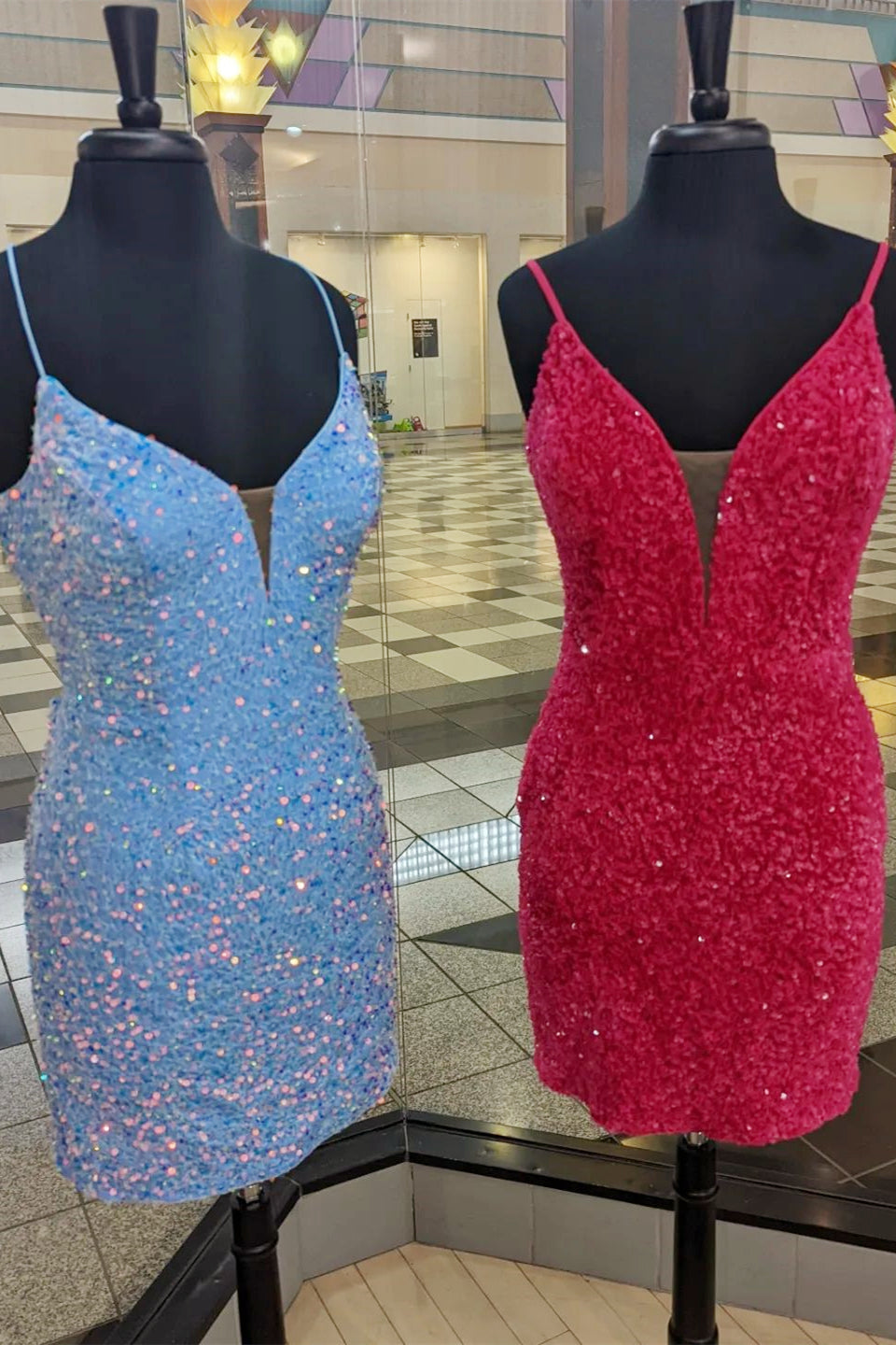 Red Sequin Straps V Neck Lace Up Homecoming Dress