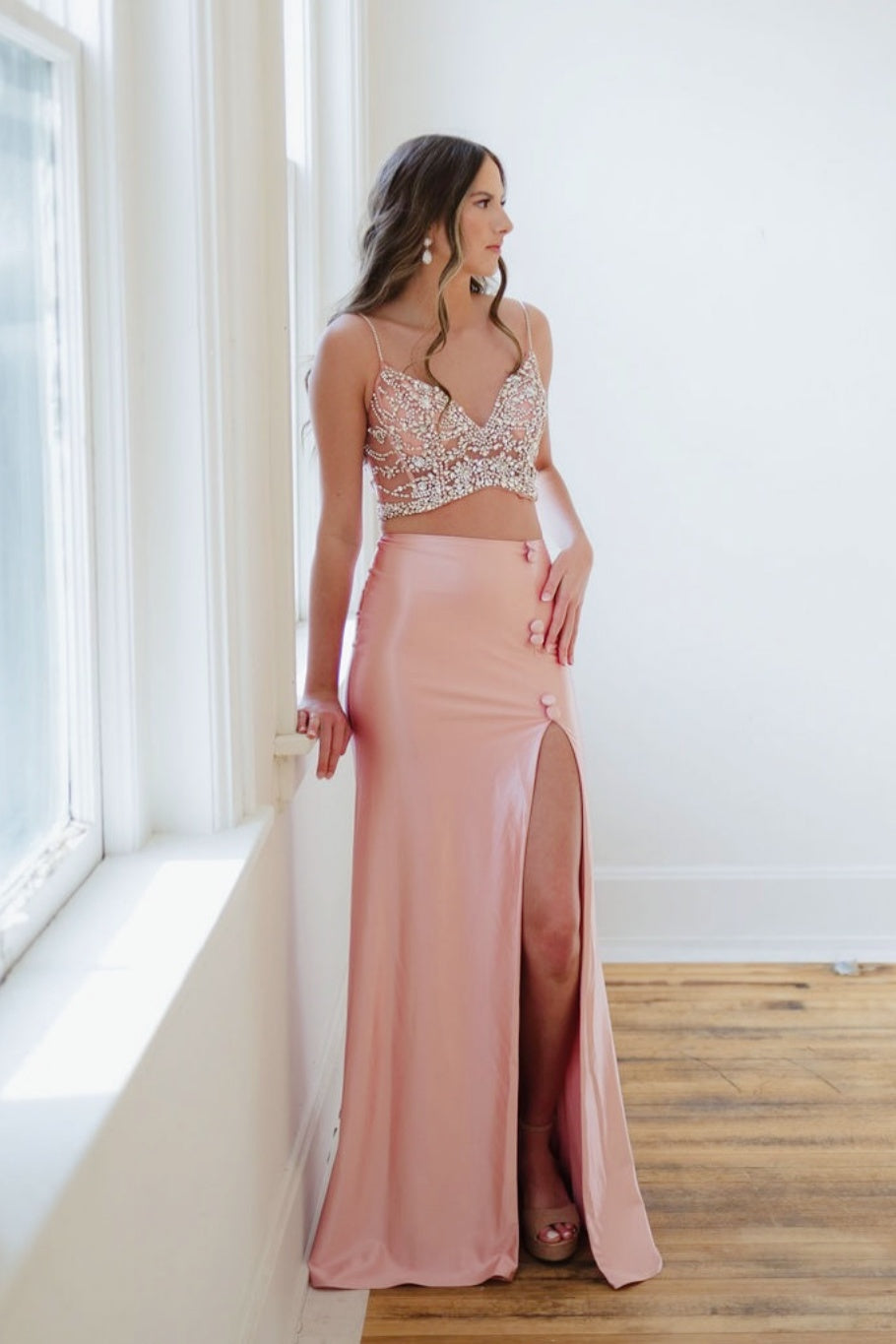 This rose pink satin dress features spaghetti straps, a V-neck, and a fitted silhouette with a rhinestone-embellished bustier. It has a side slit, floor-length design, and a back zipper with hook and eye closure for a perfect fit.