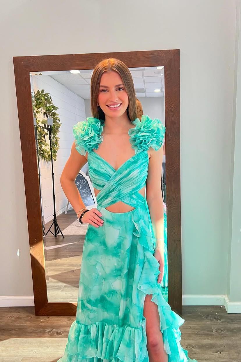 Sexy Pink Floral Cutouts A-line Ruffle Long Dress