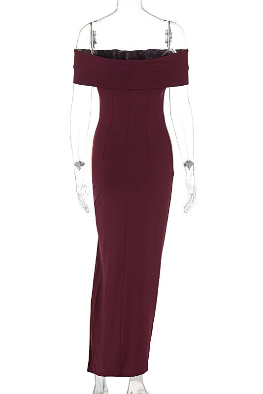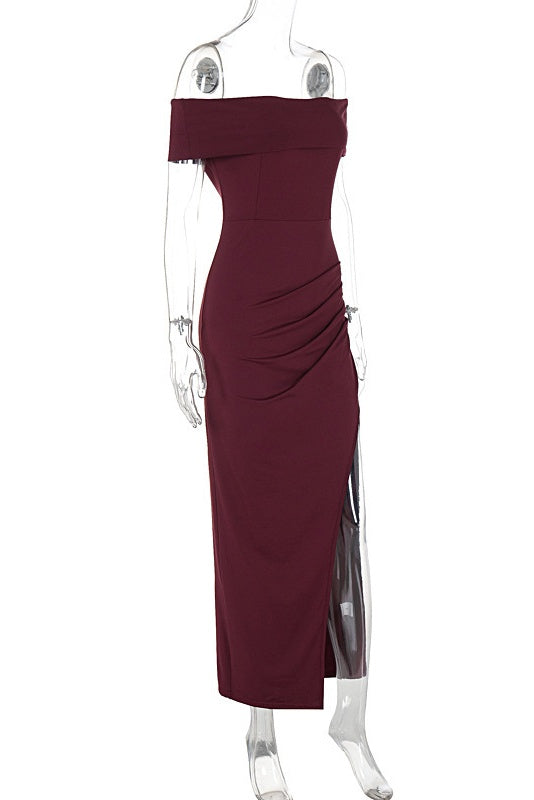 Burgundy mermaid dress in spandex with an off-the-shoulder neckline and slim-fit bodice. The flowing hem and side slit create graceful movement for an elegant silhouette. Ideal for formal events and special occasions.