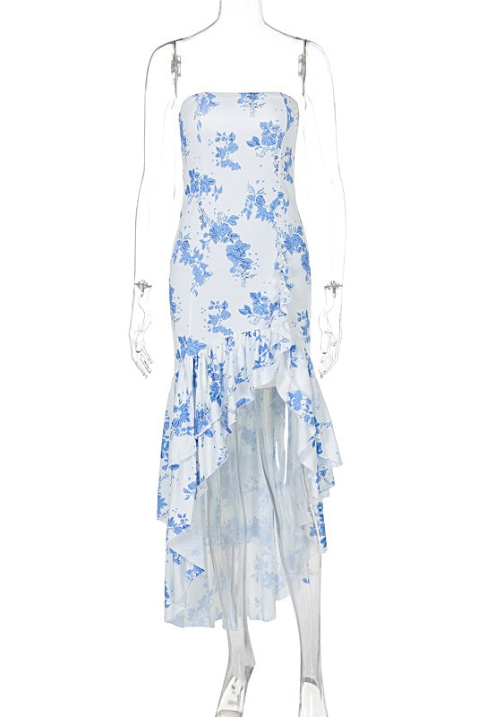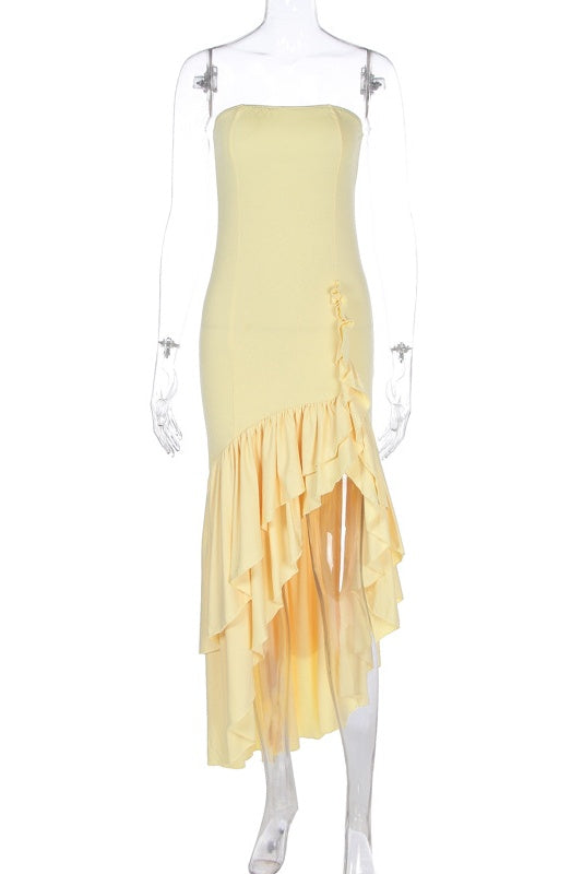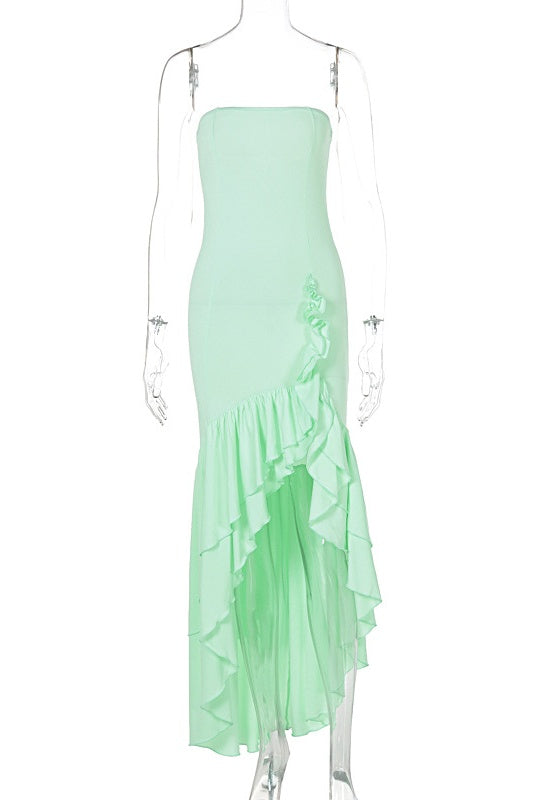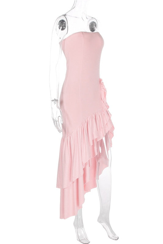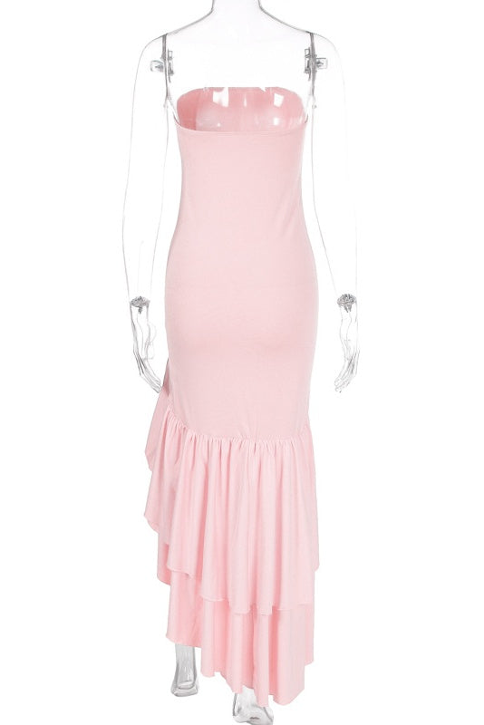 Pink Strapless Asymmetric Ruffle Hem Long Dress