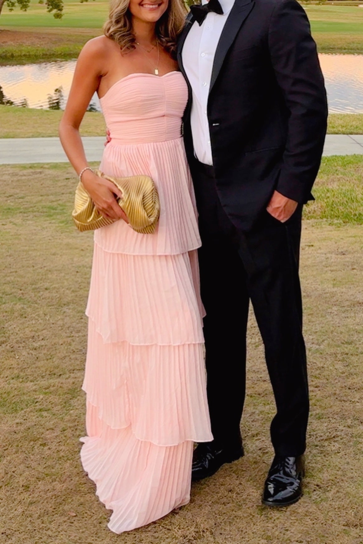 Strapless Pink Chiffon Pleated Tiered Maxi Dress