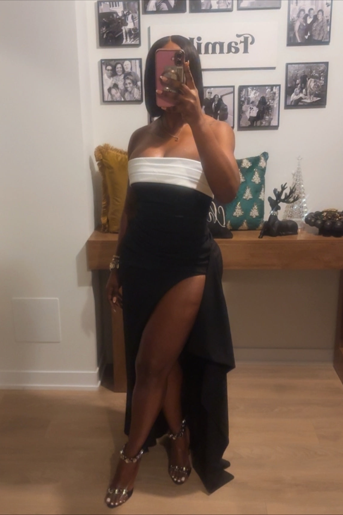This dress is made of spandex and has a fitted silhouette with a strapless neckline. The side slit is adorned with ruffles, and the back features a full-length zip-up design.