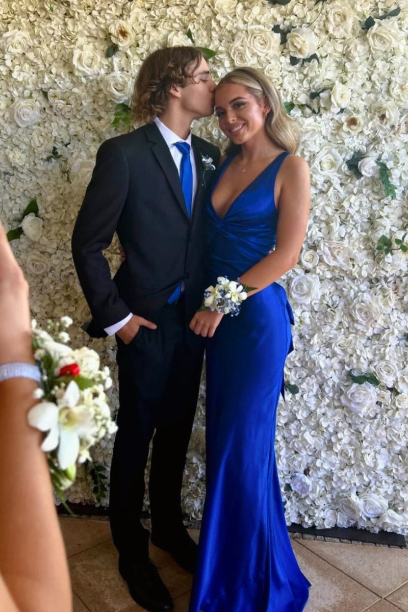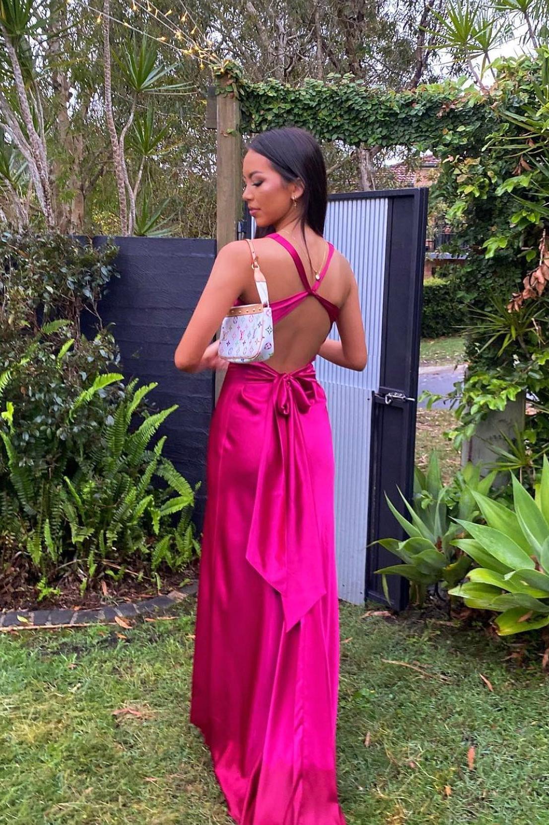 Elegant V-neck party dress in soft satin with an A-line silhouette. Features a distinctive front-knot design and graceful bow detail at the back. Full-length cut perfect for formal occasions.