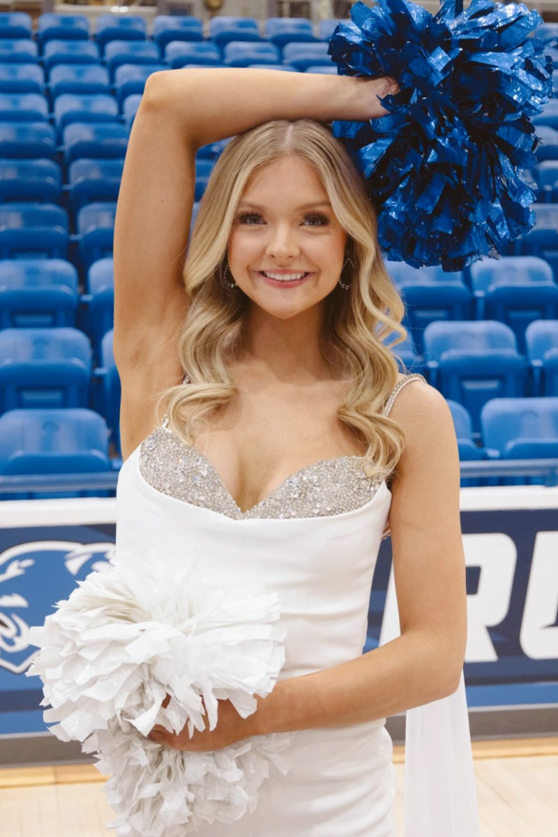 • Rhinestone-embellished sweetheart neckline with spaghetti straps