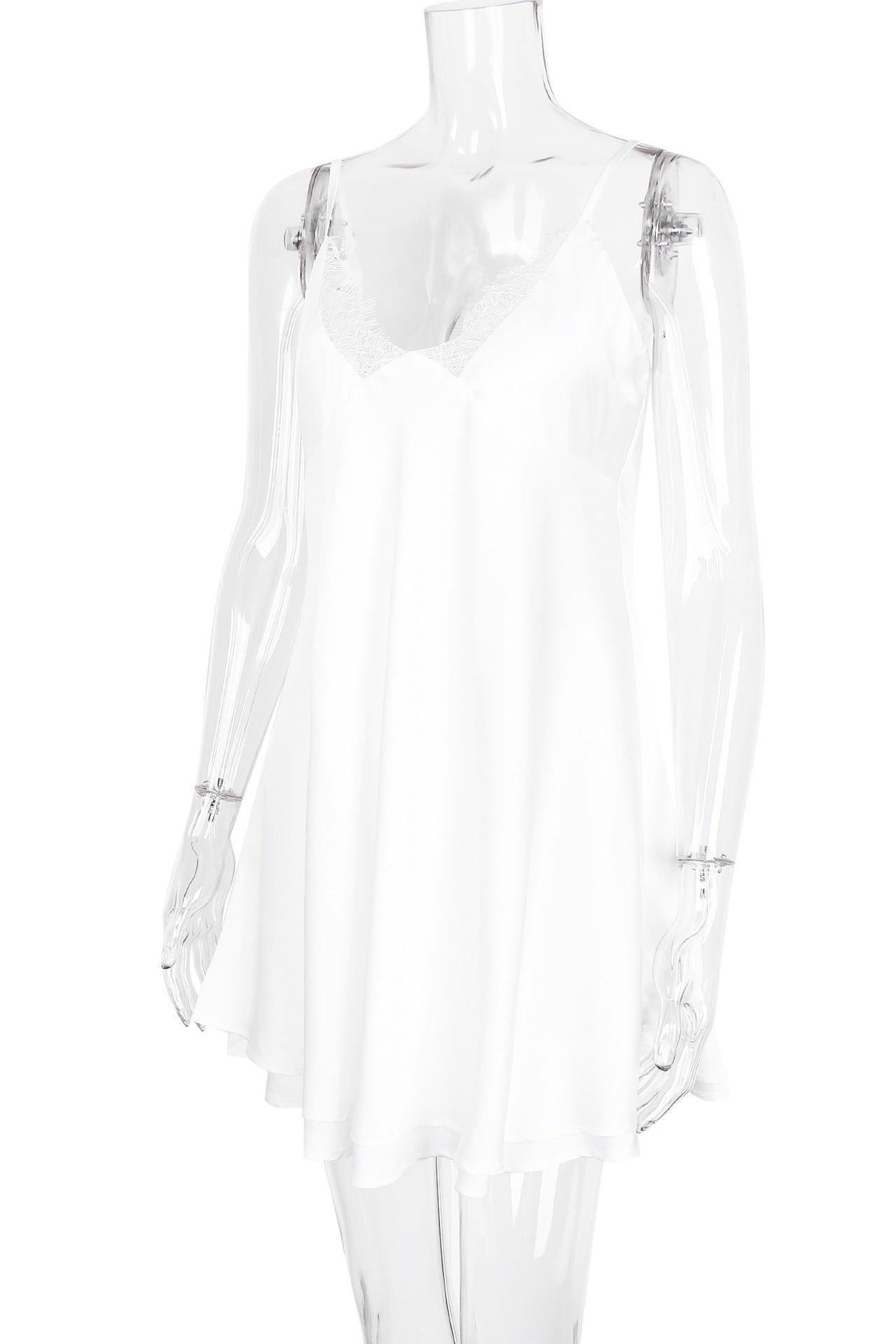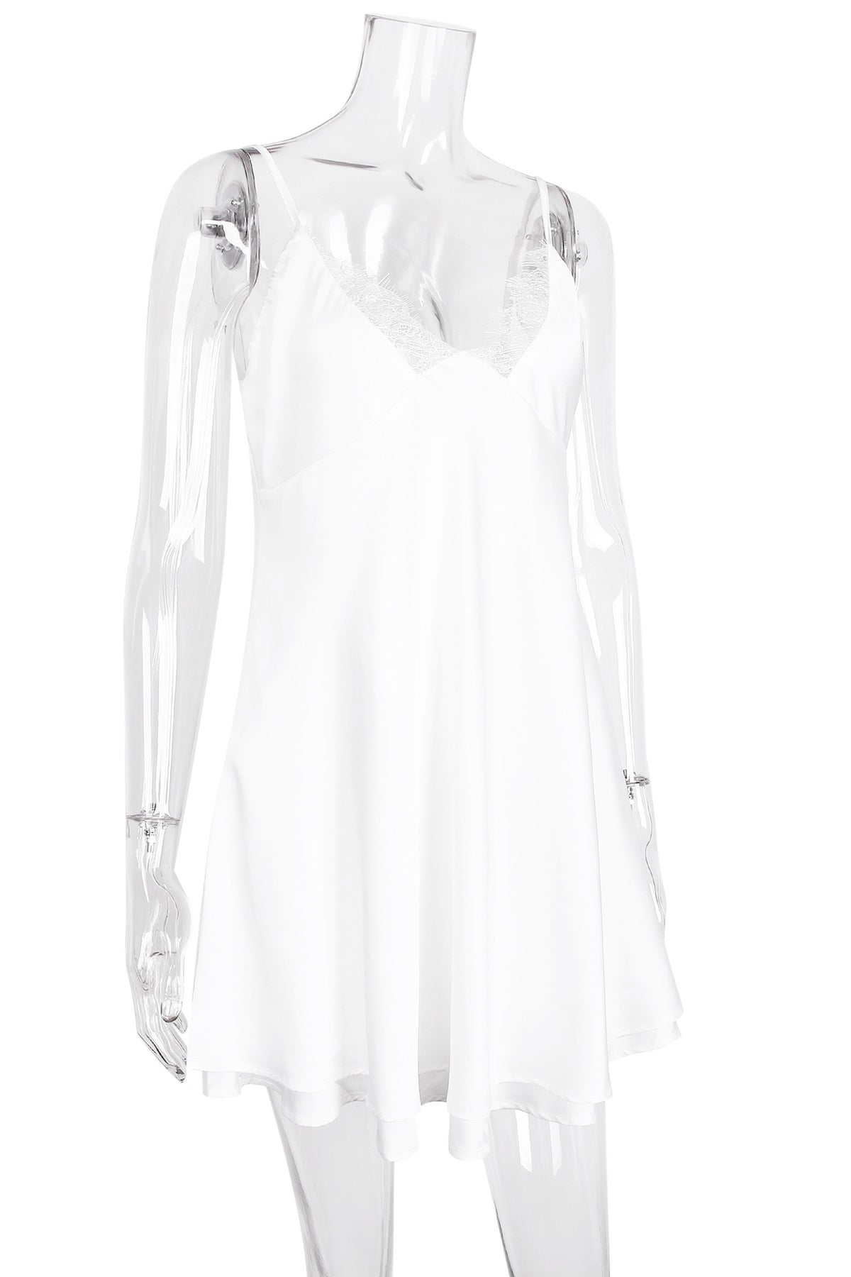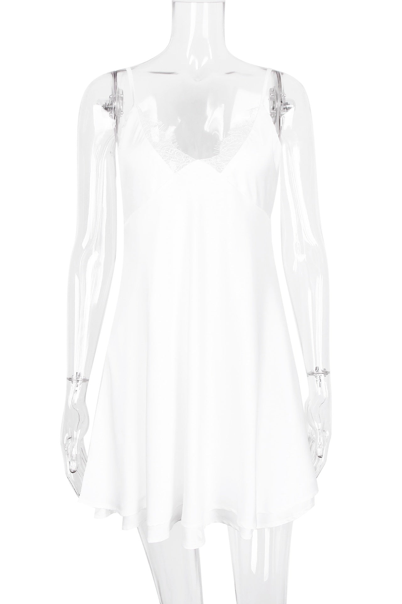 Crafted from polyester, this white A-line mini dress features a satin finish and a V-neckline with delicate spaghetti straps. The bust is adorned with intricate lace trim, complemented by a flowing hem and a low back design, creating an elegant yet modern silhouette.