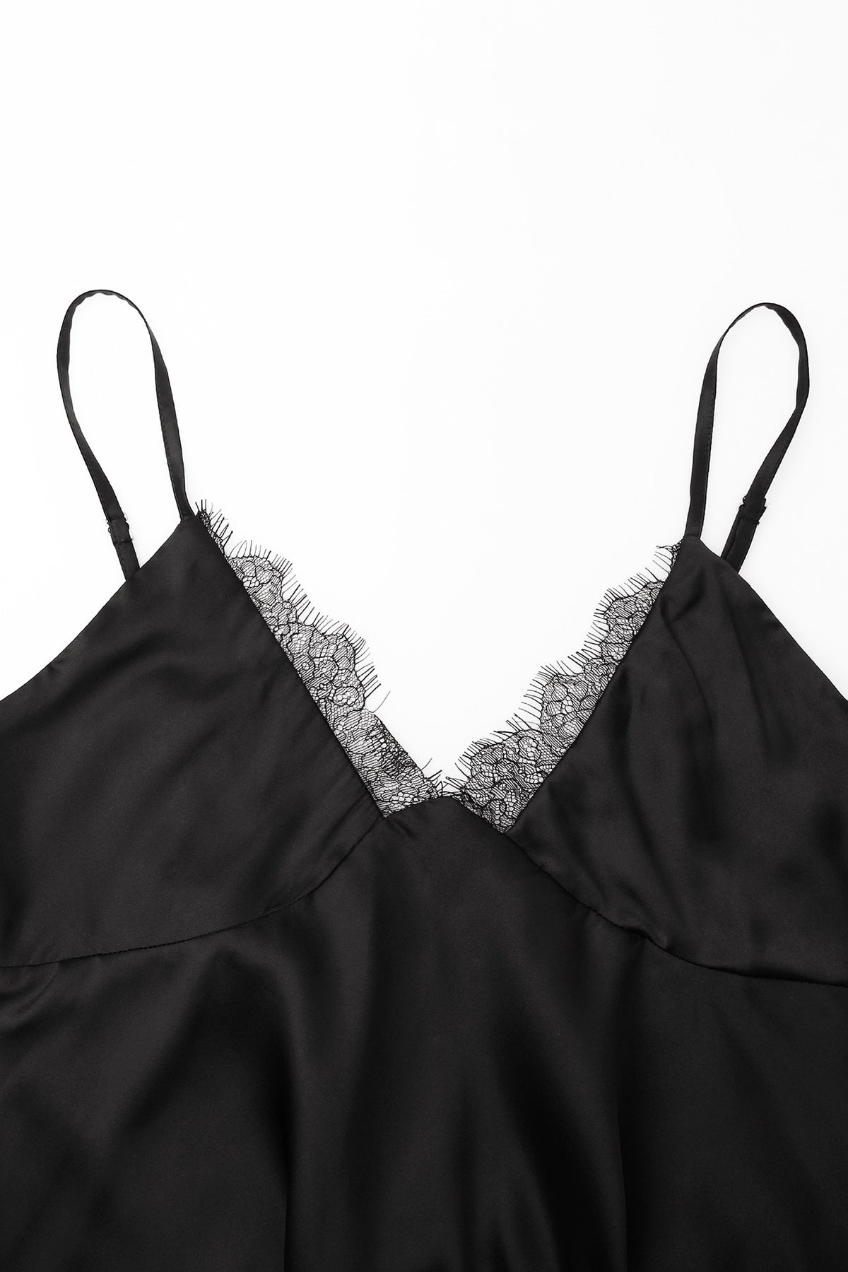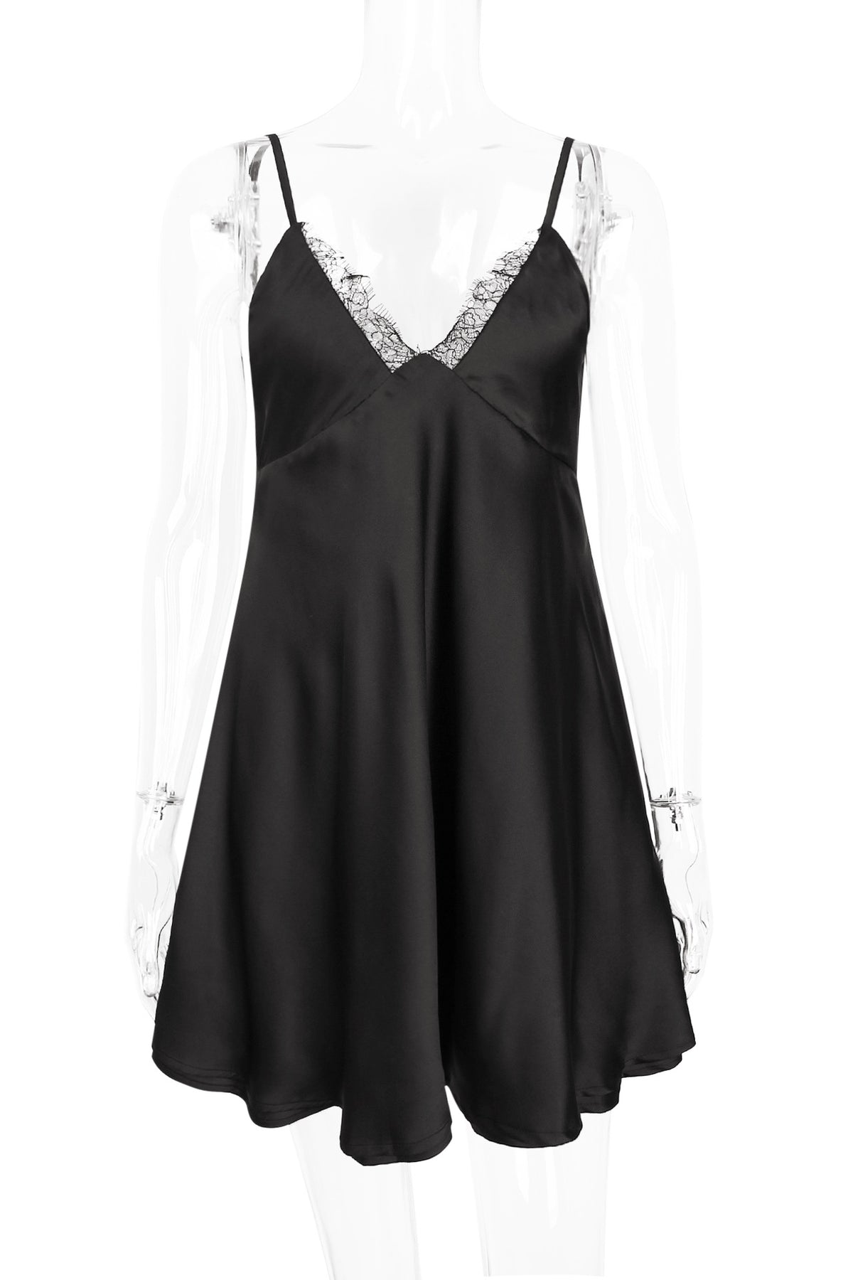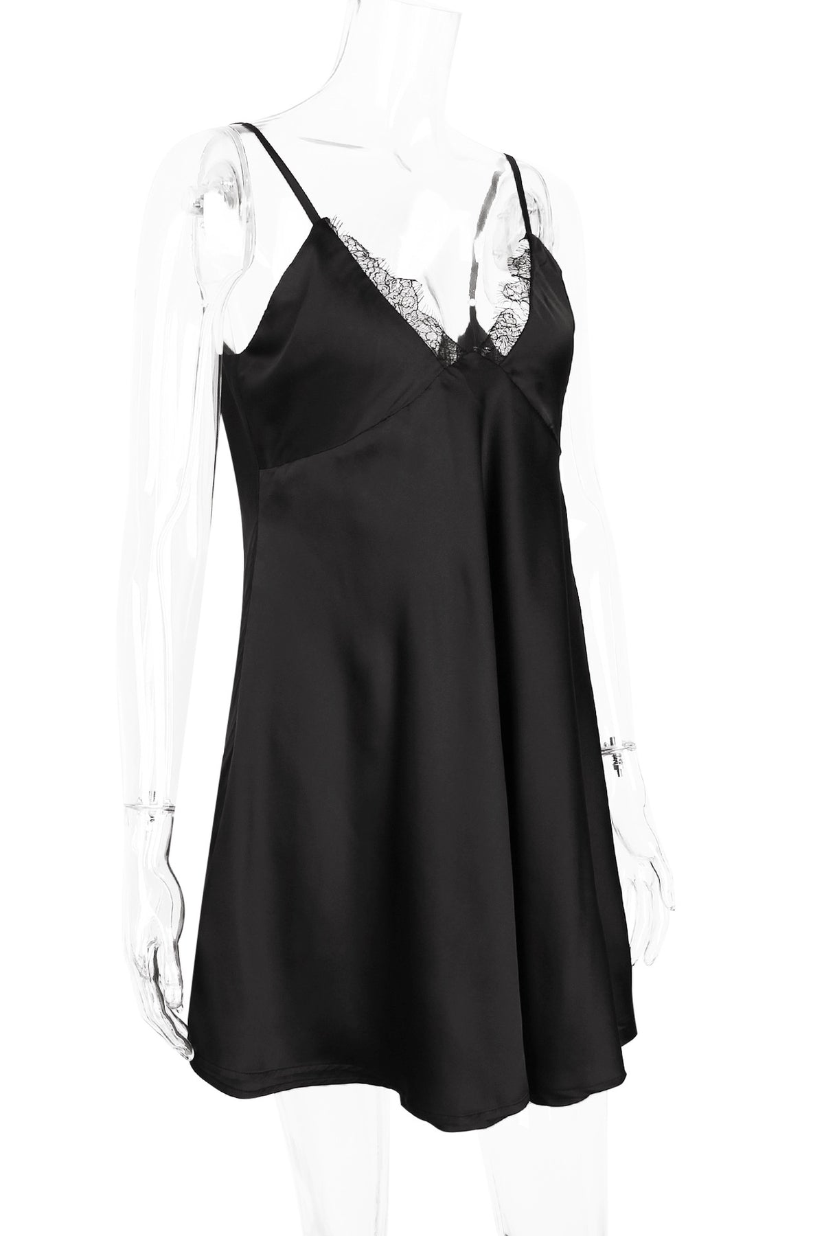 Crafted from polyester, this white A-line mini dress features a satin finish and a V-neckline with delicate spaghetti straps. The bust is adorned with intricate lace trim, complemented by a flowing hem and a low back design, creating an elegant yet modern silhouette.