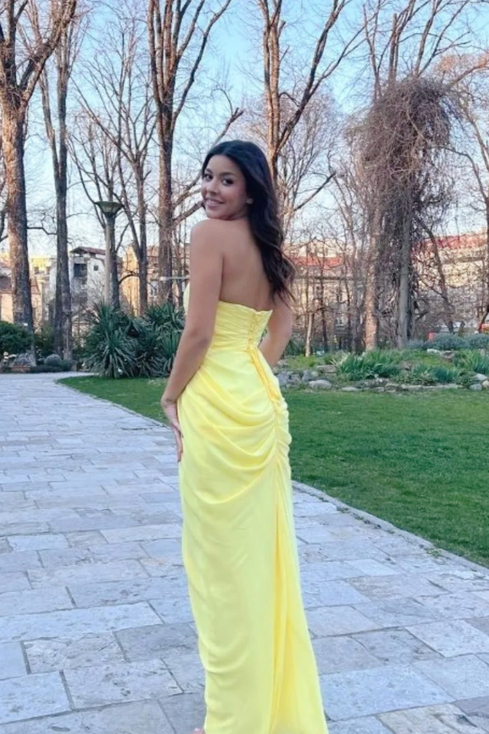 This yellow long dress is made of stretchy spandex with an A-line silhouette. It features a strapless neckline, an asymmetric flowy ruffle hem, a side slit, and a stylish lace-up back.